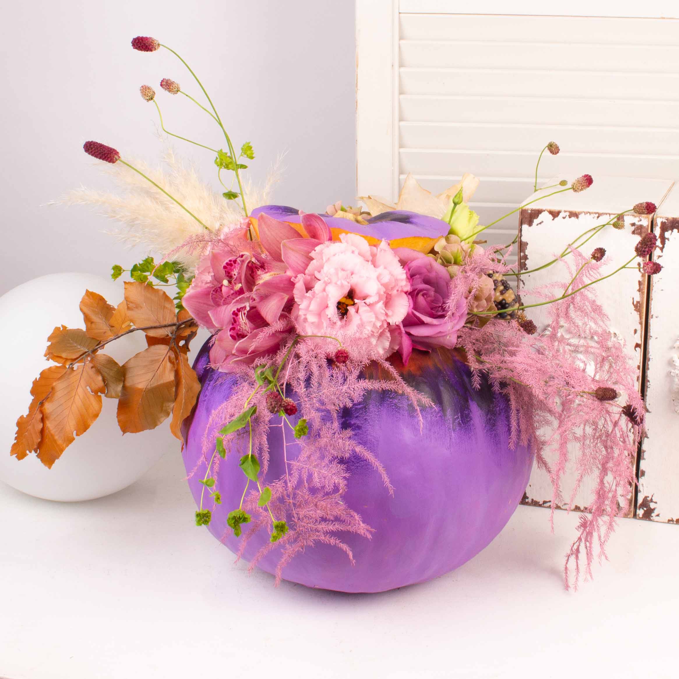 Iubim emotiile si bucuria pe care le vedem pe chipul celor care primesc flori si aranjamente florale pregatite in floraria Purple Flowers. De aceea ne straduim de fiecare data sa cream aranjamente unice care sa surprinda prin forma si culoare. Acest aranjament cu bostan mov, orhidee cymbidium, lisianthus si alte flori este cadoul de care ai nevoie atunci cand vrei sa spui „Te iubesc!” unei persoane dragi.