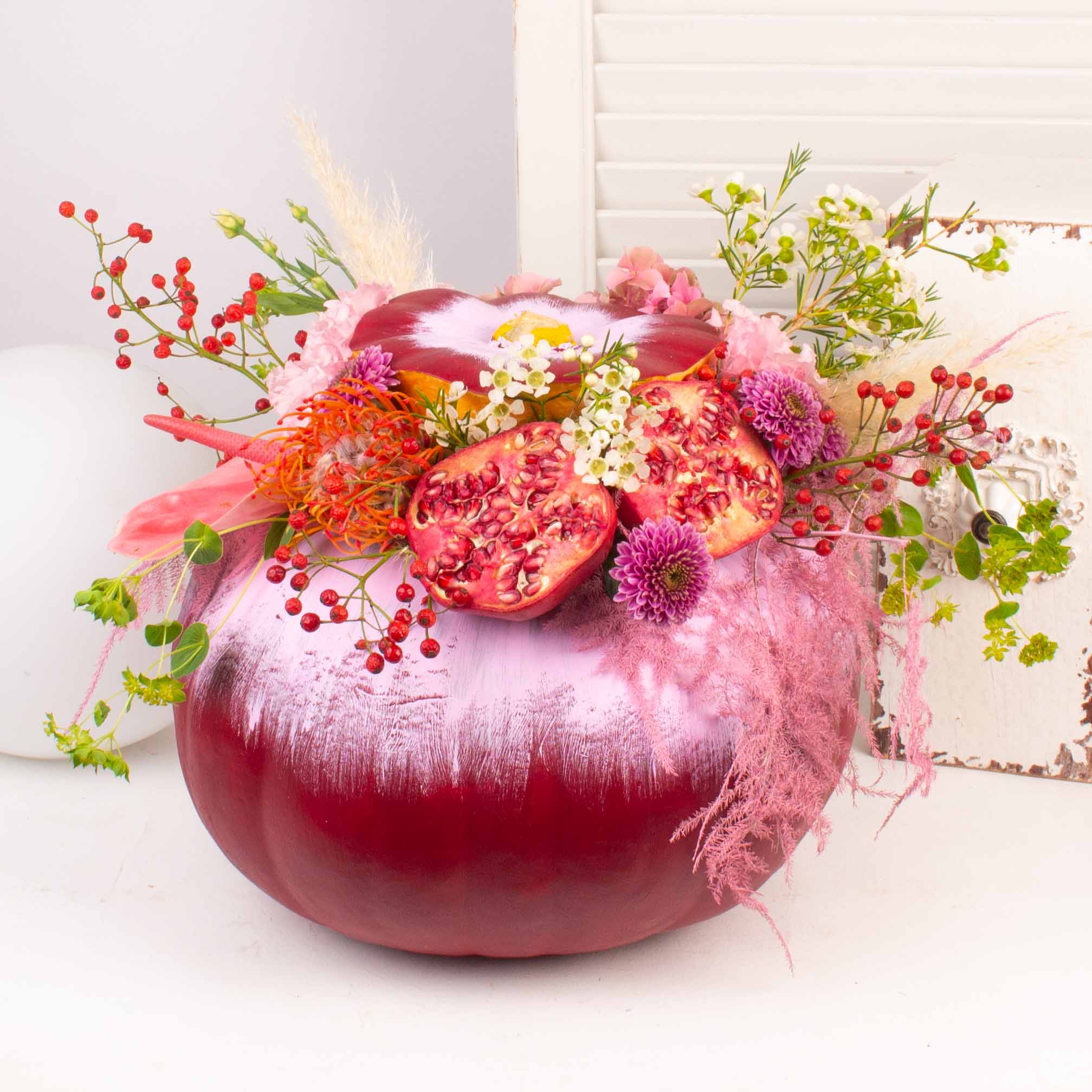 Iubim emotiile si bucuria pe care le vedem pe chipul celor care primesc flori si aranjamente florale pregatite in floraria Purple Flowers. De aceea ne straduim de fiecare data sa cream aranjamente unice care sa surprinda prin forma si culoare. Acest aranjament cu bostan rosu, rodie si alte flori este cadoul de care ai nevoie atunci cand vrei sa spui „Te iubesc!” unei persoane dragi.