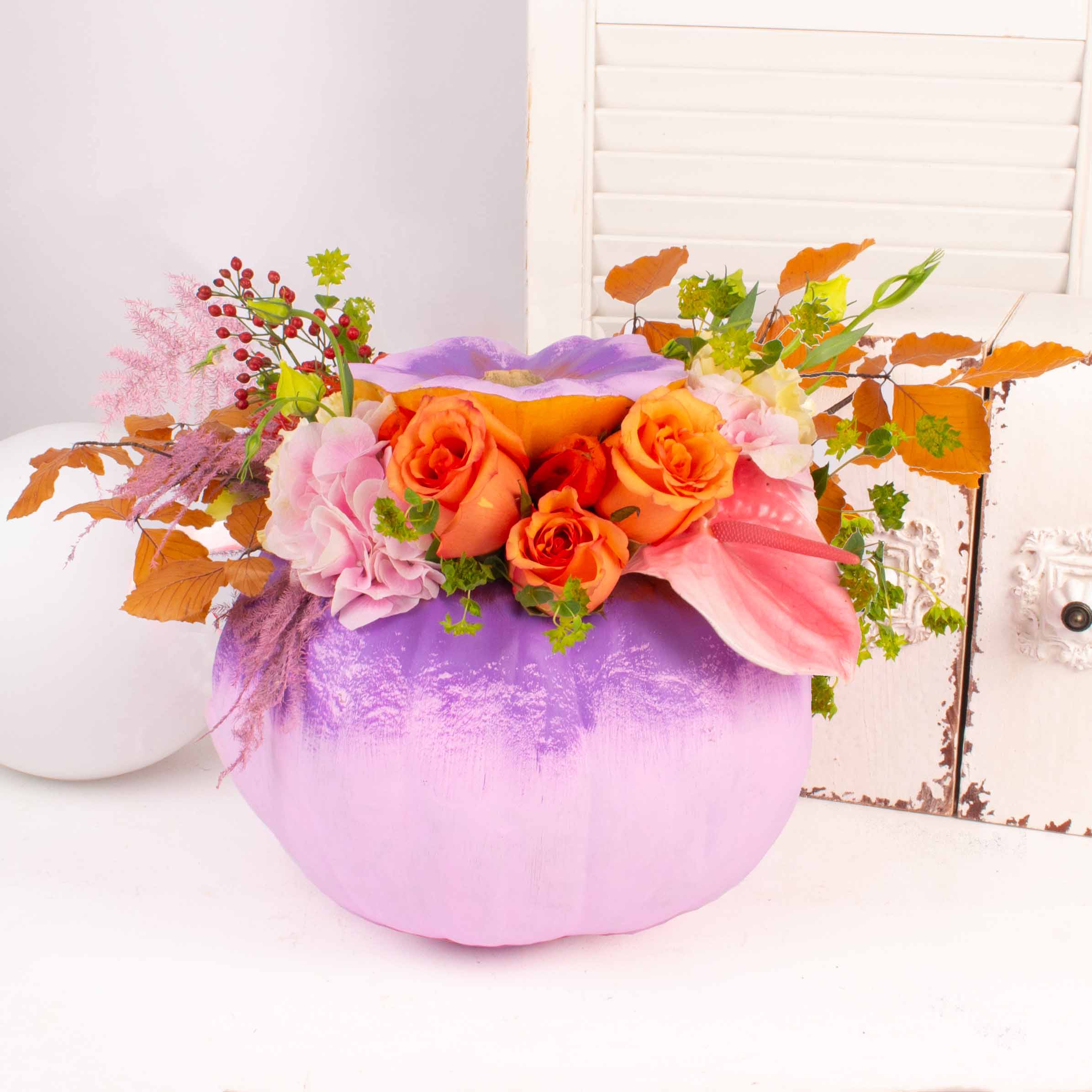 Iubim emotiile si bucuria pe care le vedem pe chipul celor care primesc flori si aranjamente florale pregatite in floraria Purple Flowers. De aceea ne straduim de fiecare data sa cream aranjamente unice care sa surprinda prin forma si culoare. Acest aranjament cu bostan roz, trandafiri, athurium si alte flori este cadoul de care ai nevoie atunci cand vrei sa spui „Te iubesc!” unei persoane dragi.