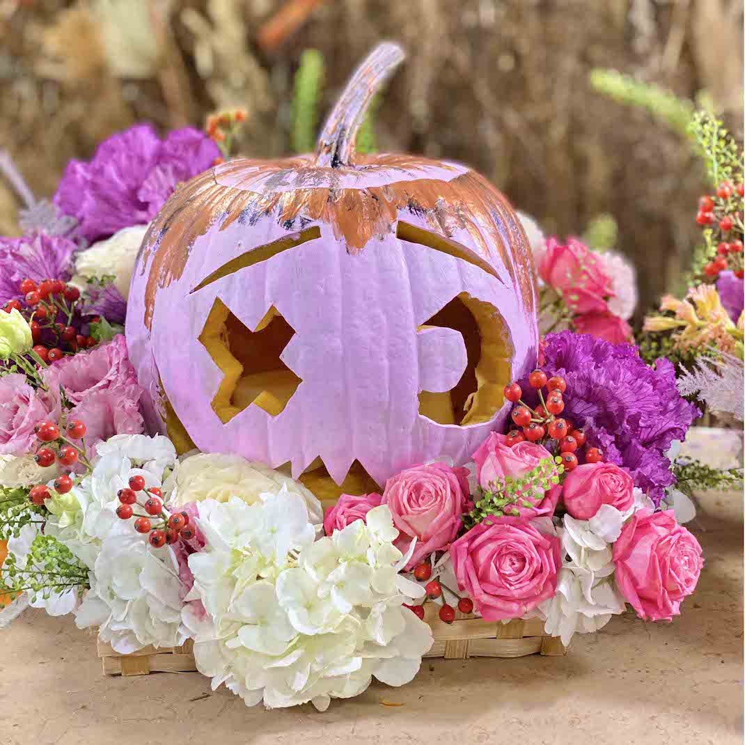 Aranjament in bostan cu trandafiri, hortensia alba si alte flori de decor.