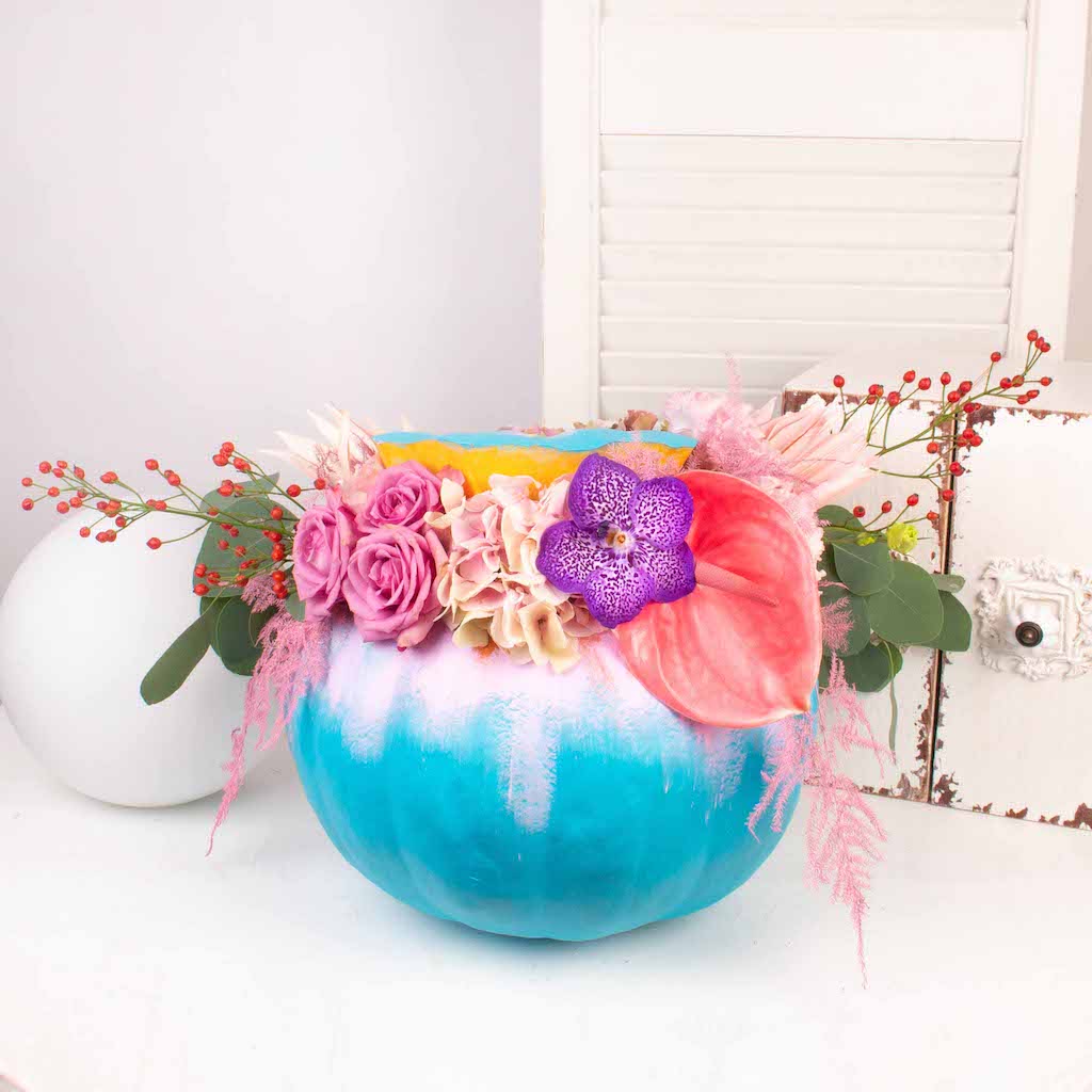 Aranjament in bostan mare turquoise cu 3 trandafiri, 2 crengute de macese, lisianthus roz, verdeata si alte flori de decor.