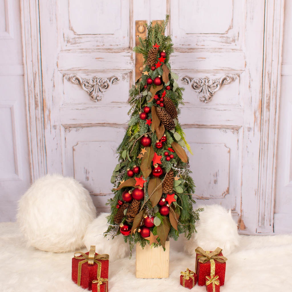Suport de brad, brad natural construit, stele lemn, conuri pin uscate, alte decoratiuni. Bradul natural construit se obtine adaugand pe o structura metalica, crengi de brad natural, crengi de nobilis, tuia si eucalipt.