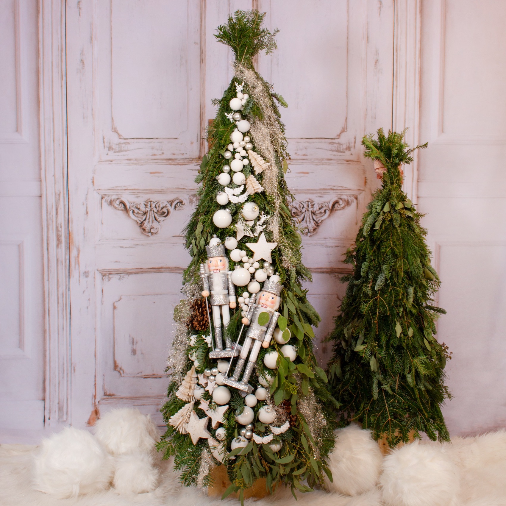 Brad cu spargatori de nuci si decoratiuni albe pe o singura parte