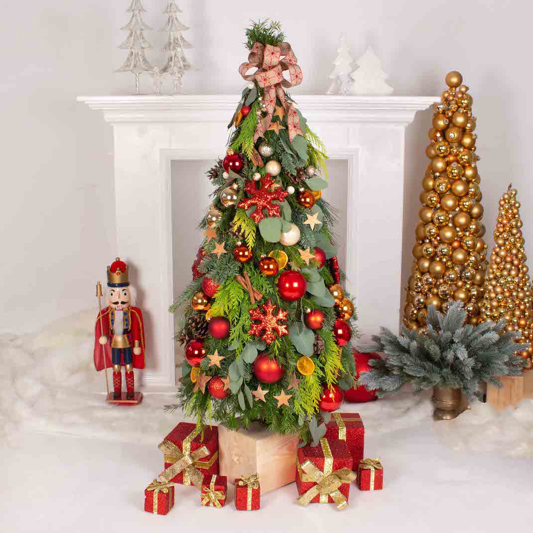 Suport brad, brad natural construit , globuri rosii si aurii, conuri de brad, figurine fulgi , scortisoara si alte decoratiuni. Bradul natural construit se obtine adaugand pe o structura metalica, crengi de brad natural, crengi de nobilis, tuia si eucalipt.