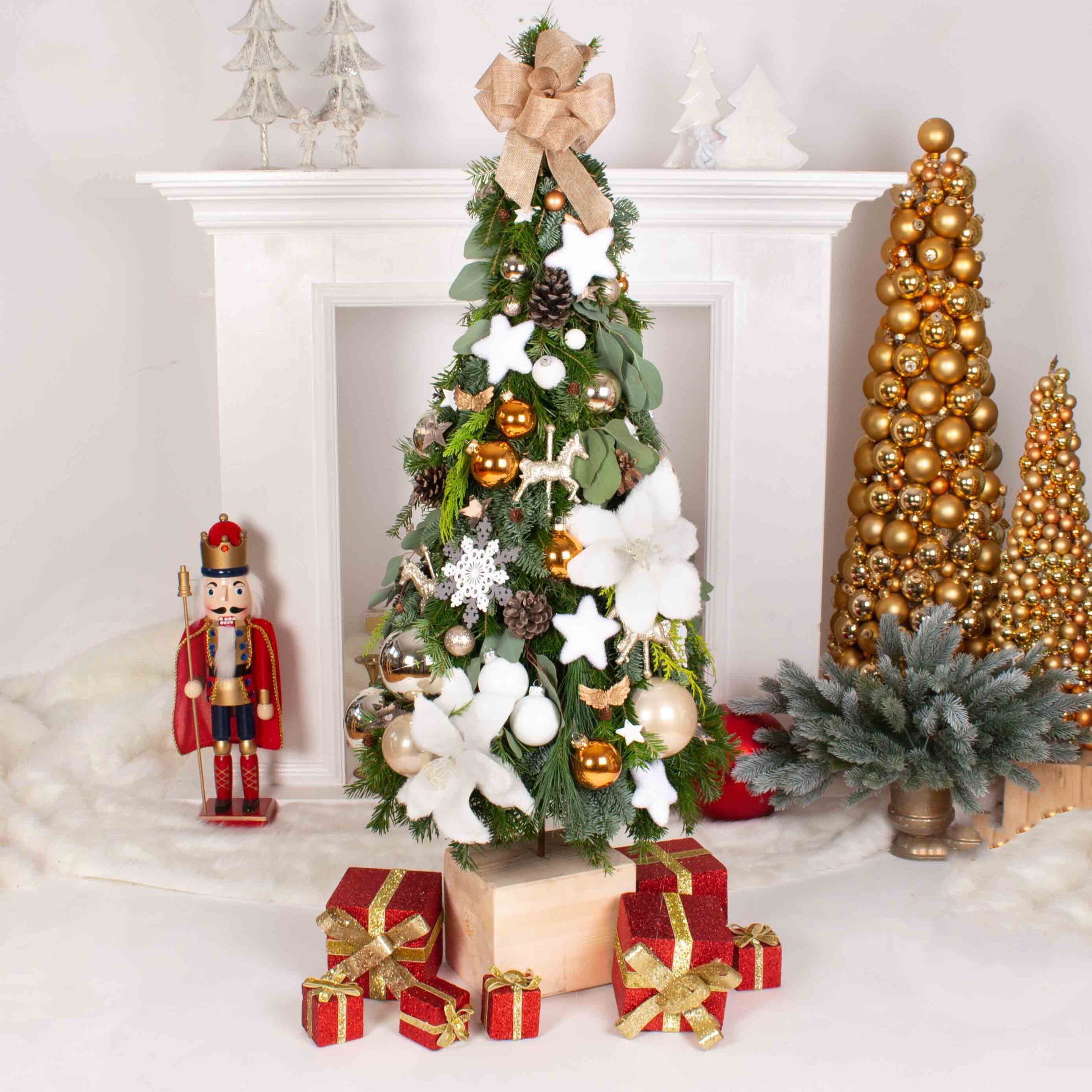 Suport brad, brad natural construit , globuri de sticla, conuri de brad, figurine calut , figurine stelute si alte decoratiuni. Bradul natural construit se obtine adaugand pe o structura metalica, crengi de brad natural, crengi de nobilis, tuia si eucalipt.