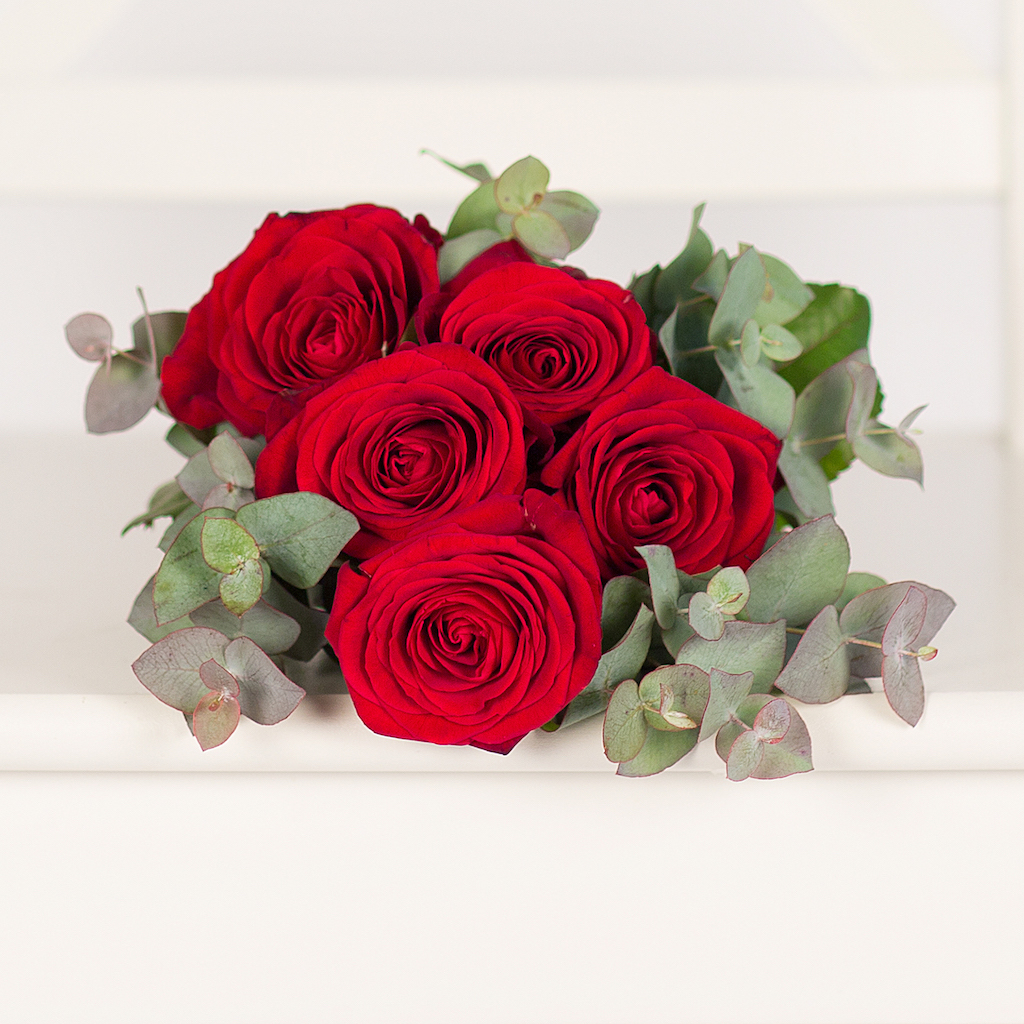 Buchet cu 5 trandafiri rosii si verdeata de decor.