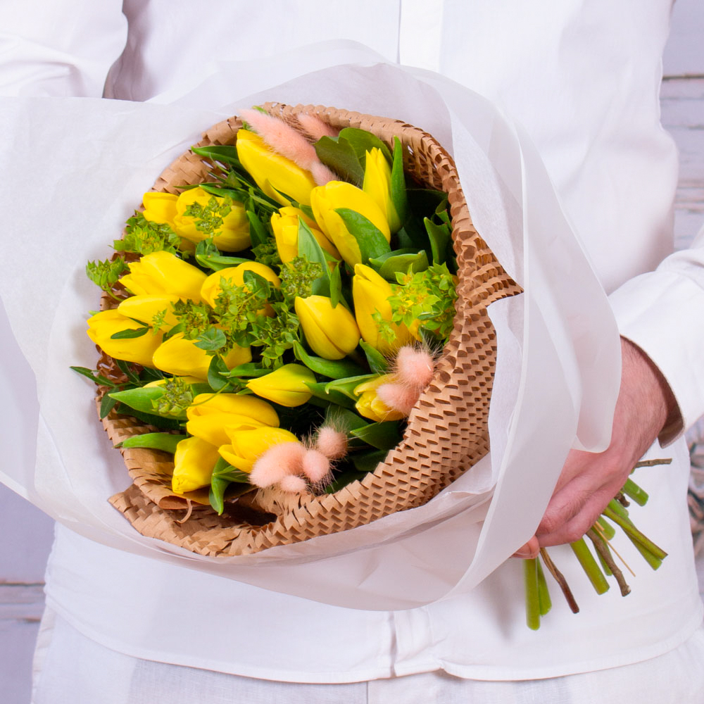 Buchet de primavara cu 19 lalele galbene si verdeata de decor.