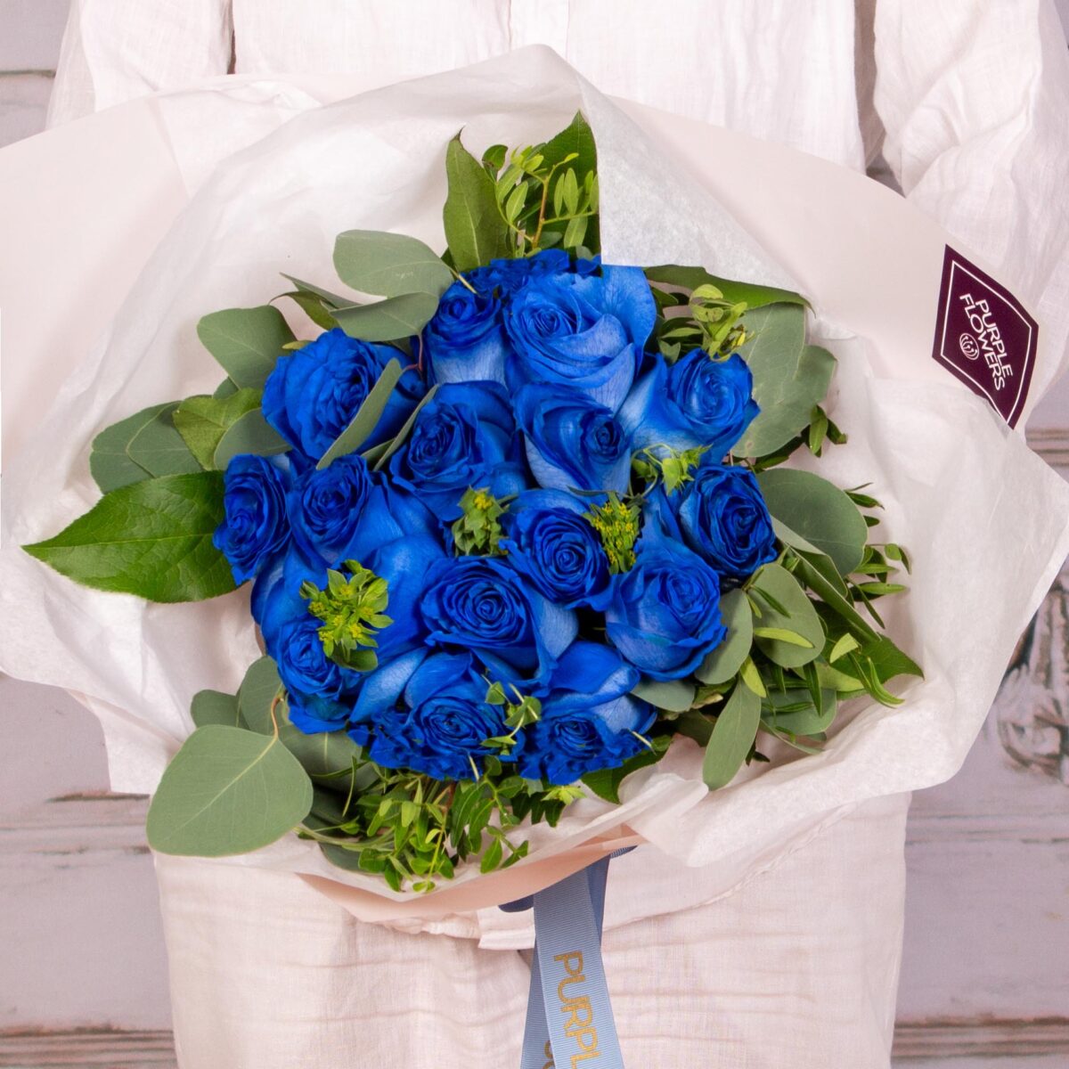 Buchet cu 19 trandafiri albastri si verdeata de decor.