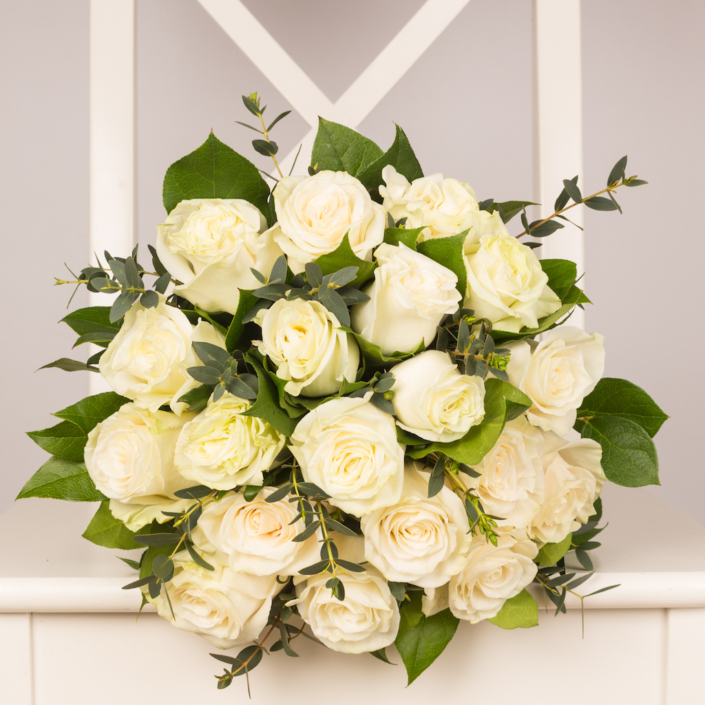 Buchet cu 19 trandafiri albi si verdeata de decor.