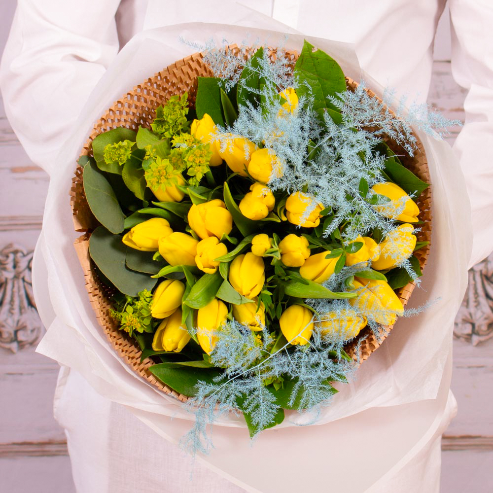 Buchet de primavara cu 25 de lalele galbene si verdeata de decor.