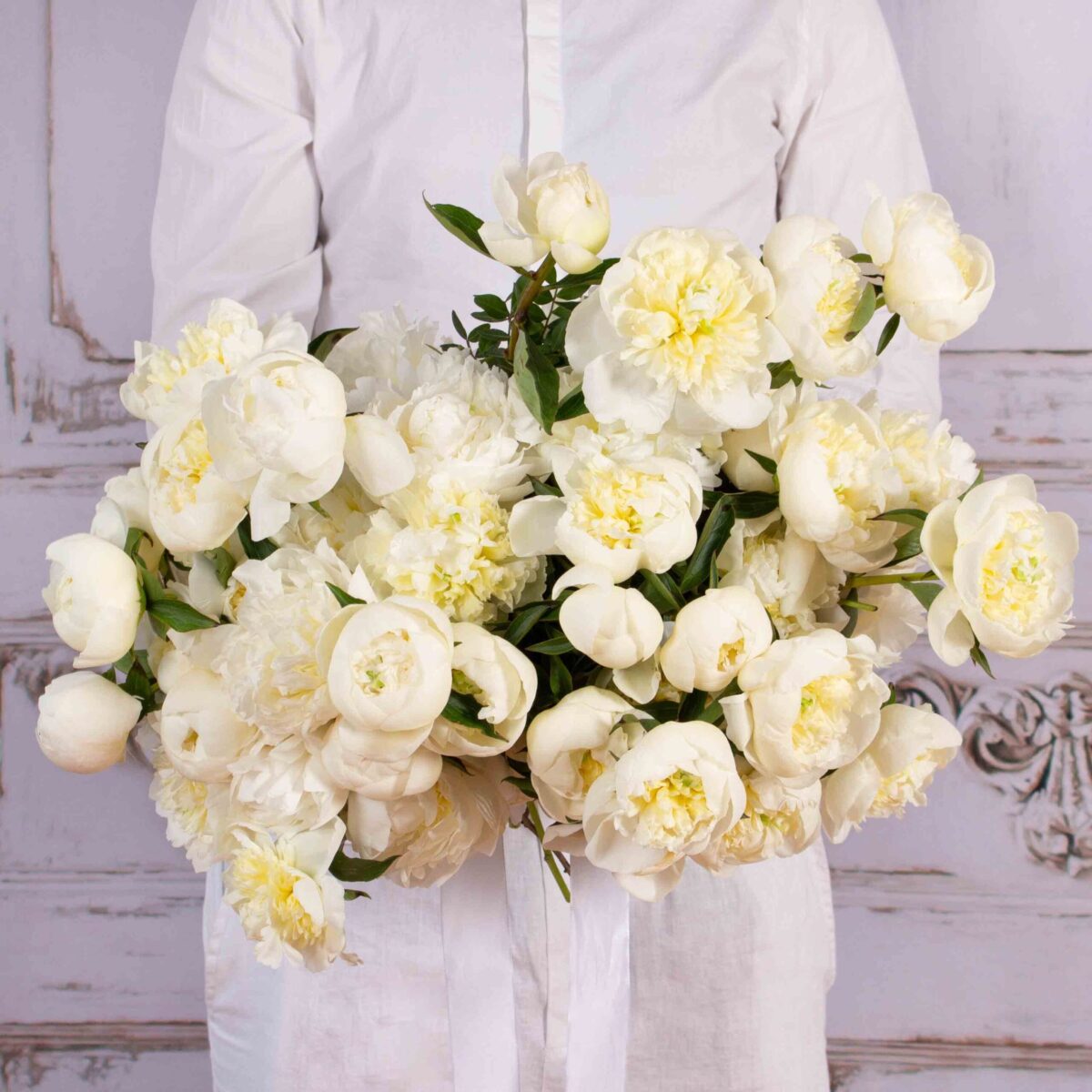 Buchet cu 39 de bujori albi si verdeata de decor.