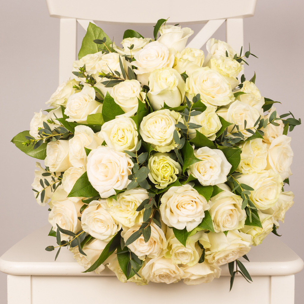 Buchet cu 51 de trandafiri albi si verdeata de decor.