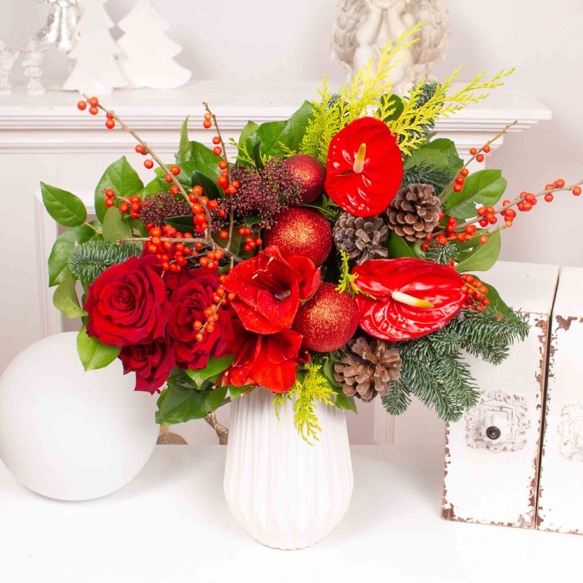 Buchet cu 3 trandafiri rosii, maryllis rosu, 3 globuri rosii, verdeata si alte flori