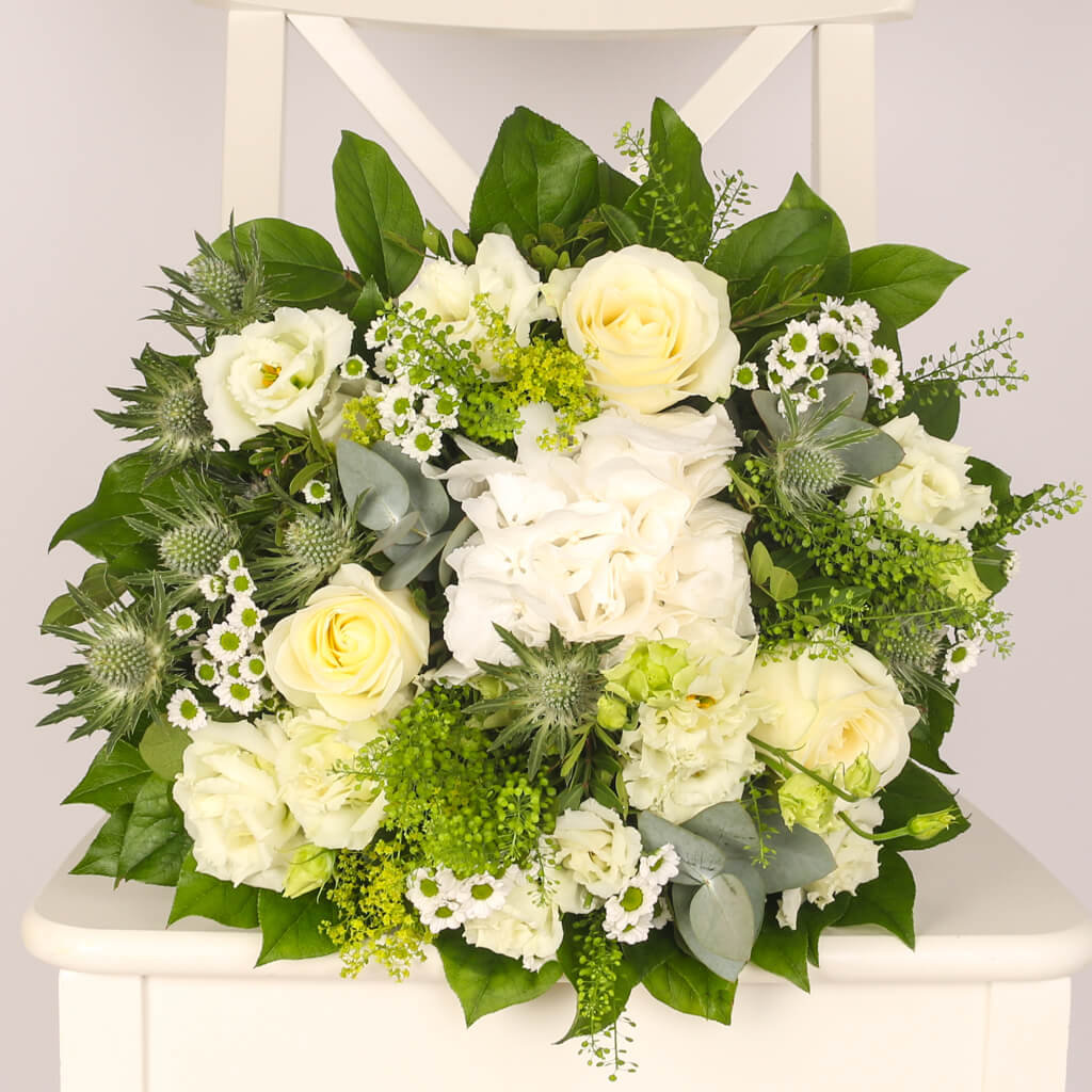 Buchet cu 3 trandafiri albi, 3 crizanteme, hortensie, verdeata si alte flori