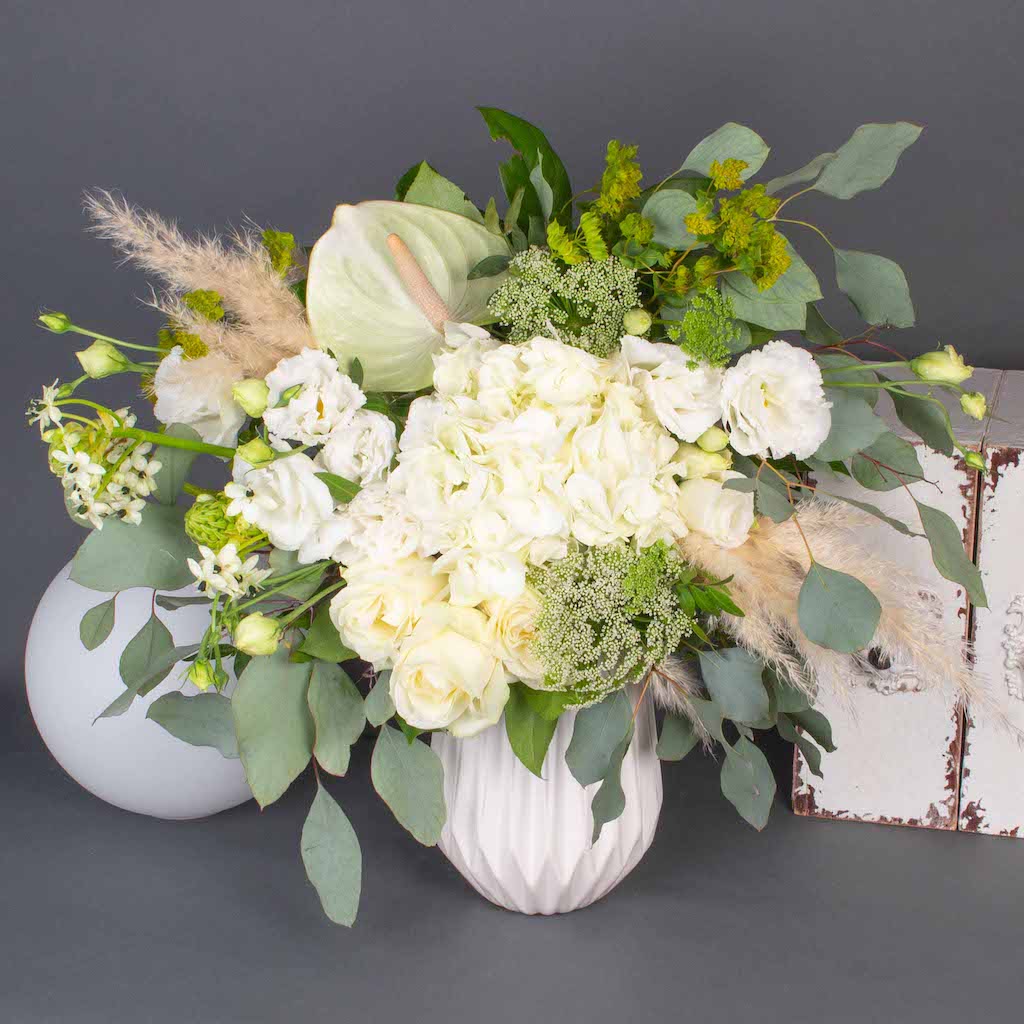 Buchet cu hortensie, 3 trandafiri albi, verdeata si alte flori