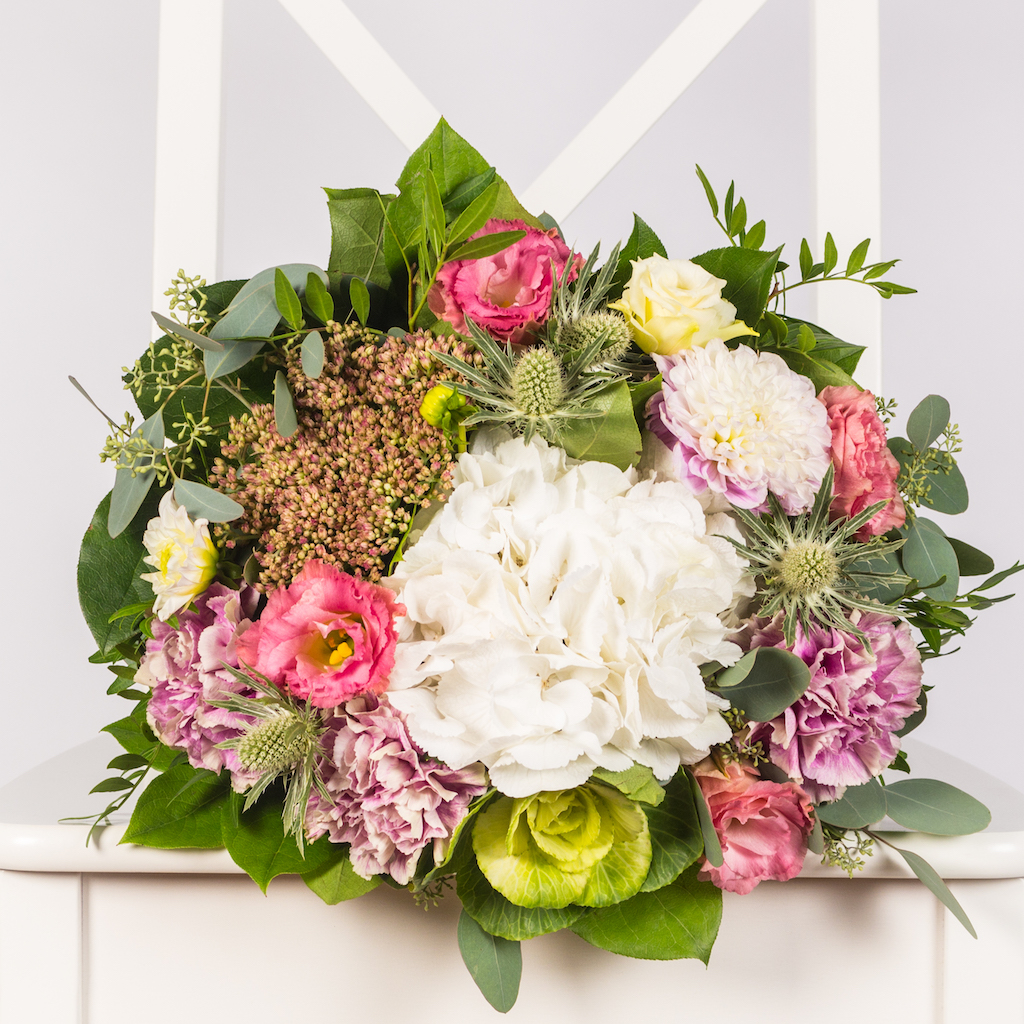 Buchet cu lisianthus roz, hortensie, 3 garoafe, verdeata si alte flori