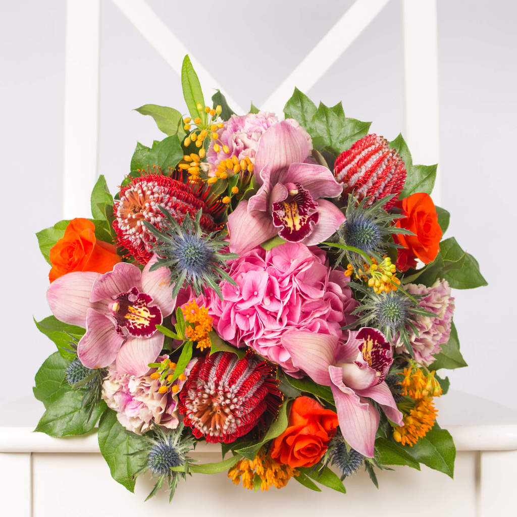 Florile aduc bucurie si iubire de fiecare data cand sunt daruite din suflet. Acest buchet cu hortensie, orhidee si protea comandat prin floraria online Purple Flowers este o surpriza deosebita si cu siguranta va schimba ziua persoanei care il va primi. Adauga un mesaj personalizat si fa o bucurie cuiva drag. Spune “Te iubesc!”, “La multi ani!”, “Felicitari!” cu un buchet de flori!