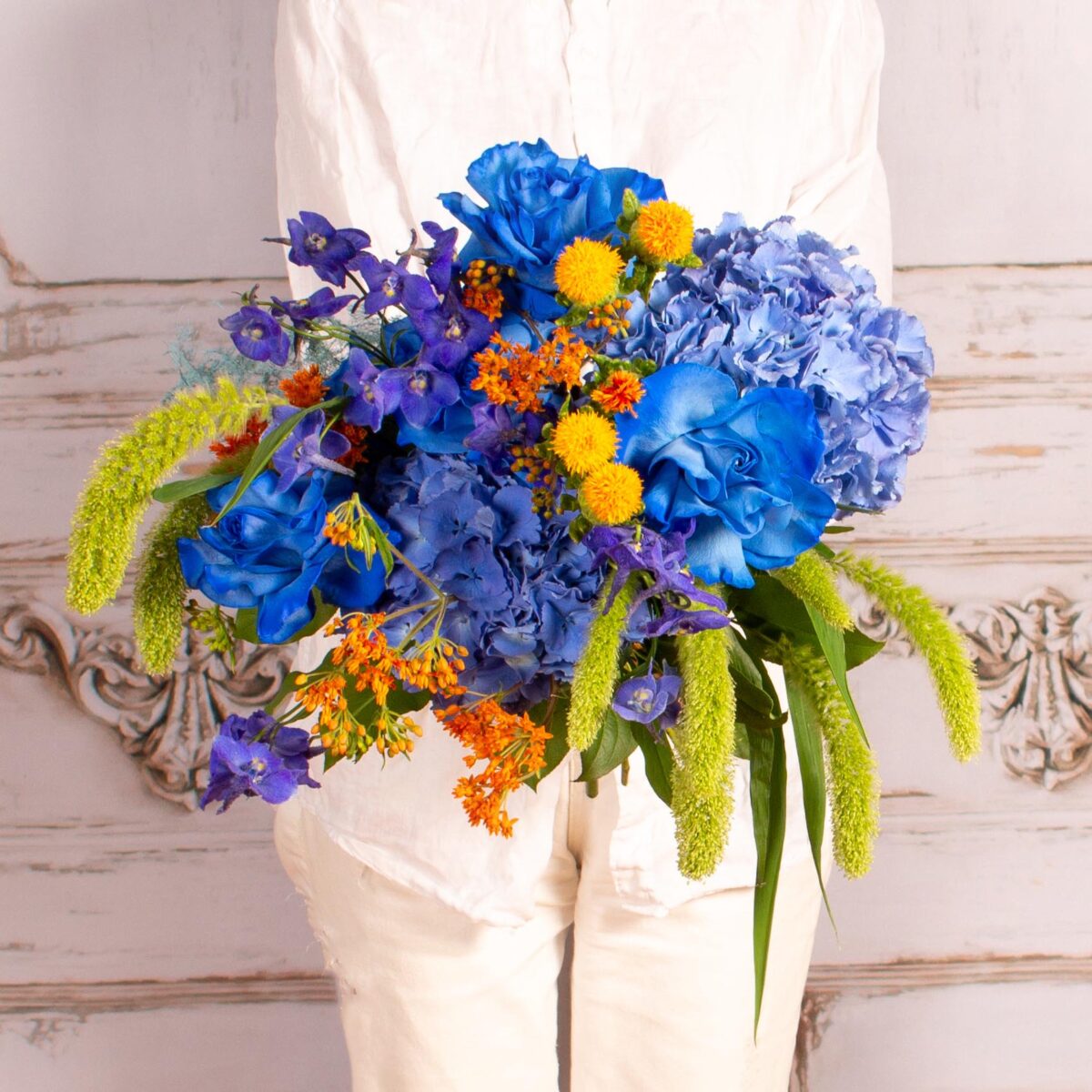 Acest buchet intr-o nuanta vibranta de albastru este alegerea ideala pentru a lasa o impresie de neuitat persoanei dragi.