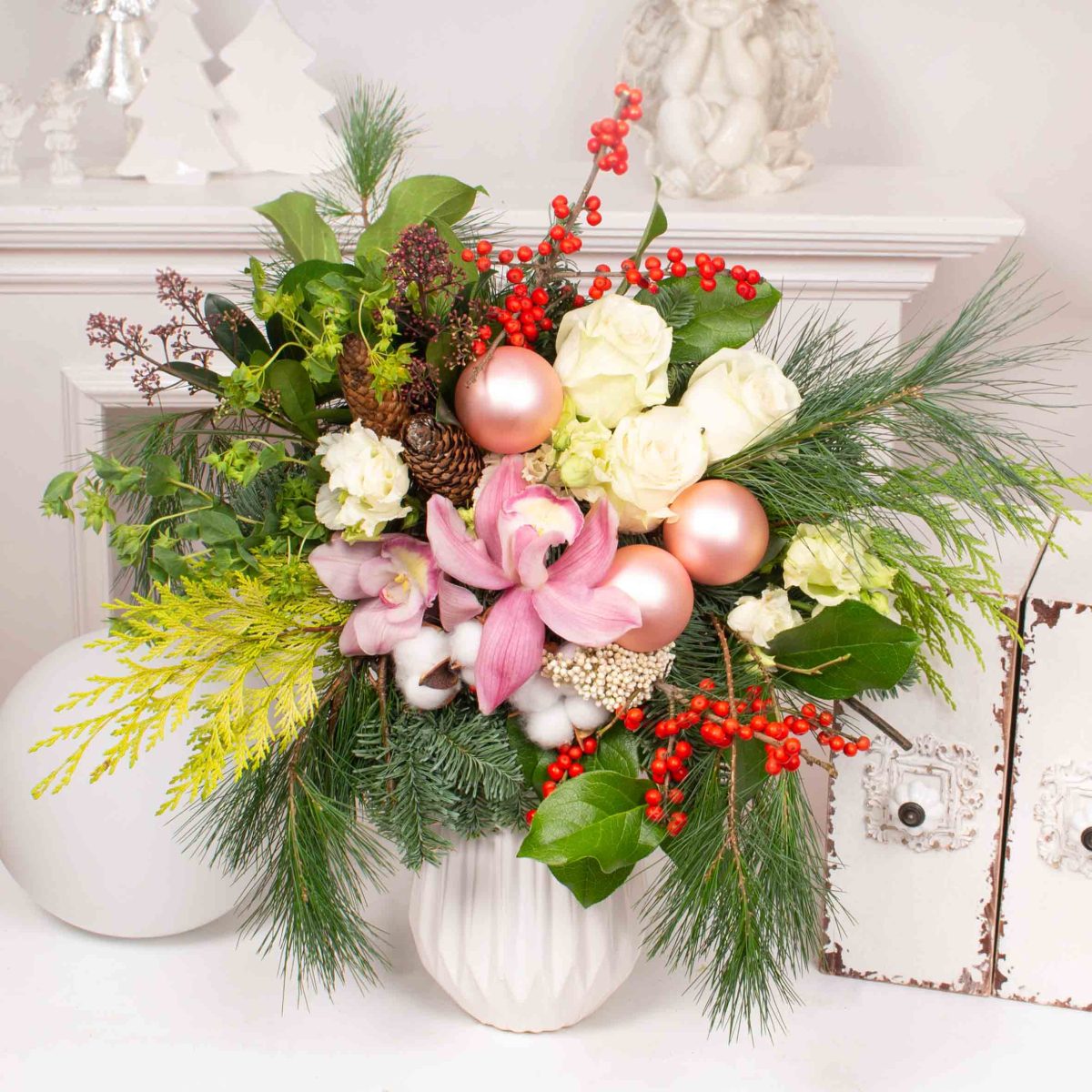 Buchet cu 2 orhidee cymbidium, ilex rosu, 3 trandafiri albi, 2 lisianthus alb, verdeata si alte flori