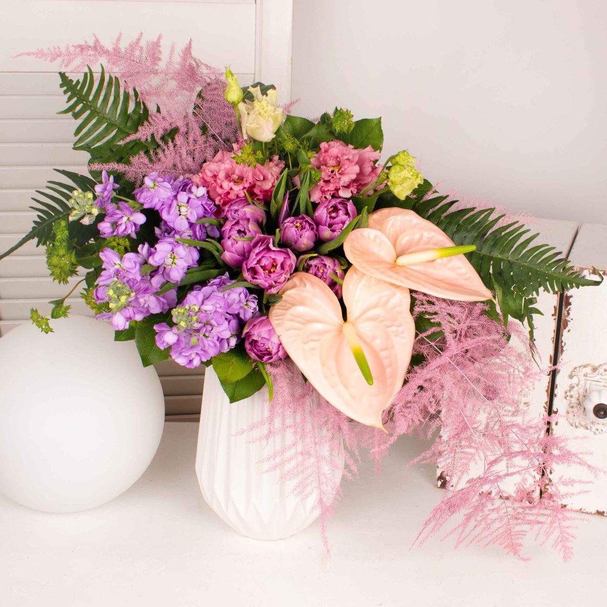 Buchet cu 2 anthurium roz, 6 lalele mov, 3 matthiola mov, lisianthus roz, 2 asparagus roz, verdeata si alte flori de decor.