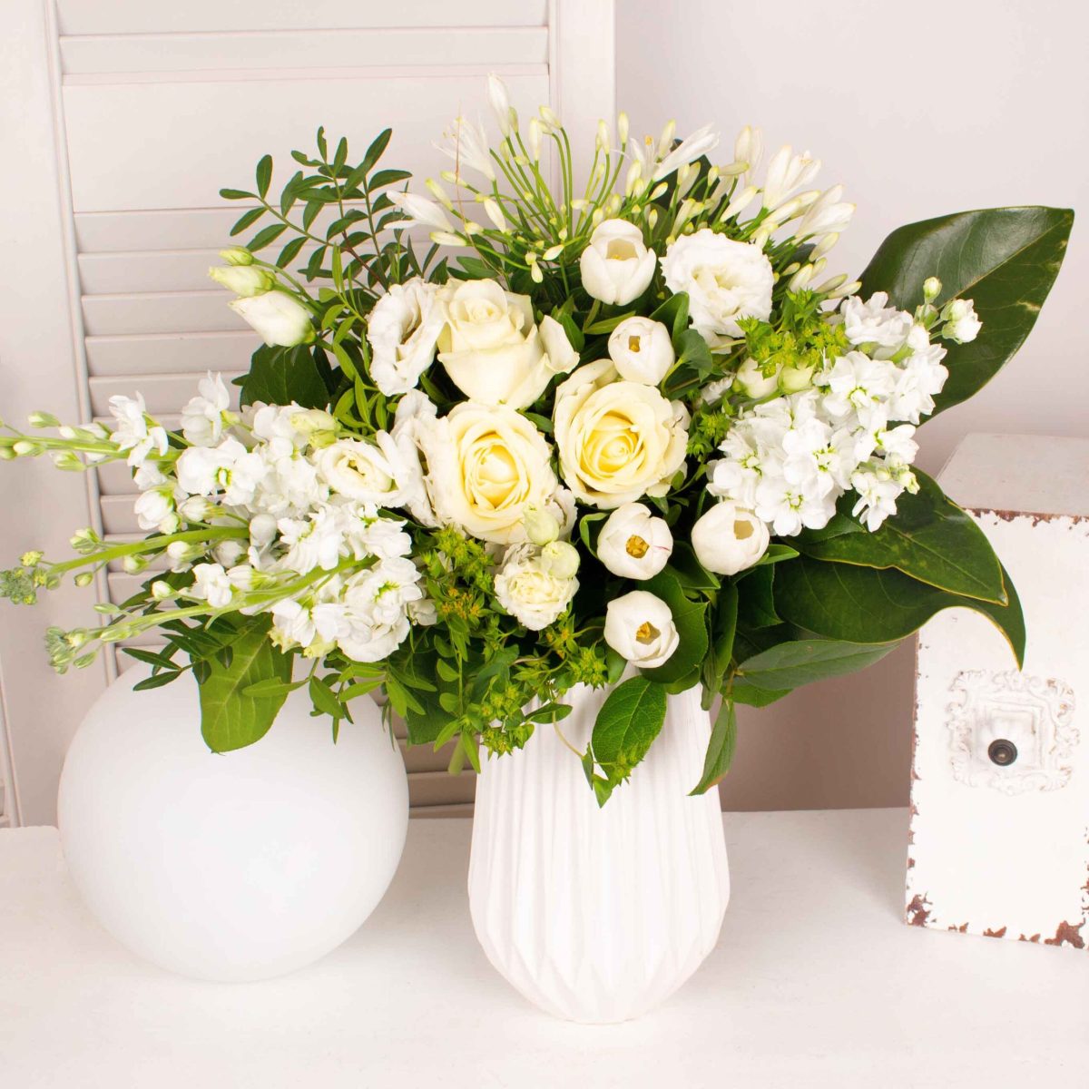 Buchet cu 3 trandafiri albi, 5 matthiola alba, 5 lalele albe, 2 agapanthus alb, 2 lisianthus alb, verdeata si alte flori de decor.