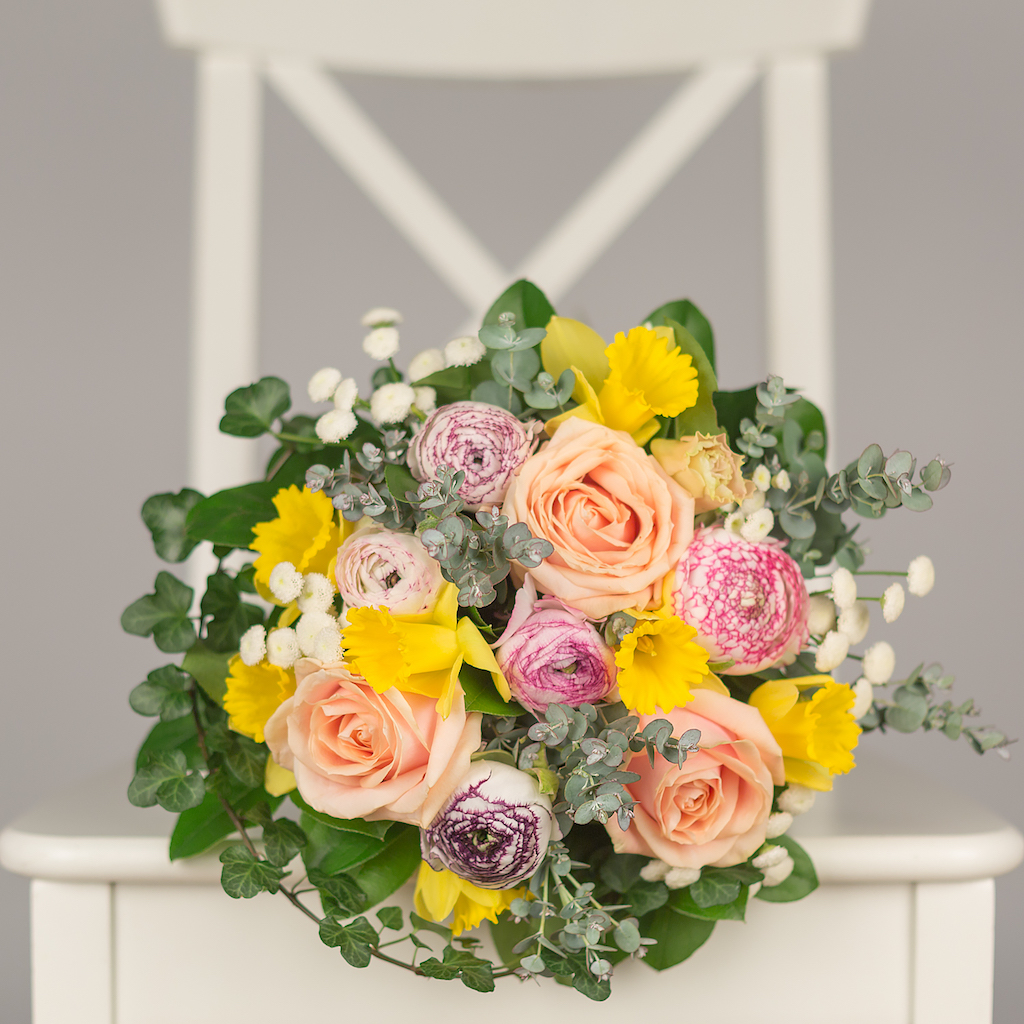 Buchet cu 3 trandafiri, 7 narcise galbene, 5 ranunculus alb-roz, verdeata si alte flori