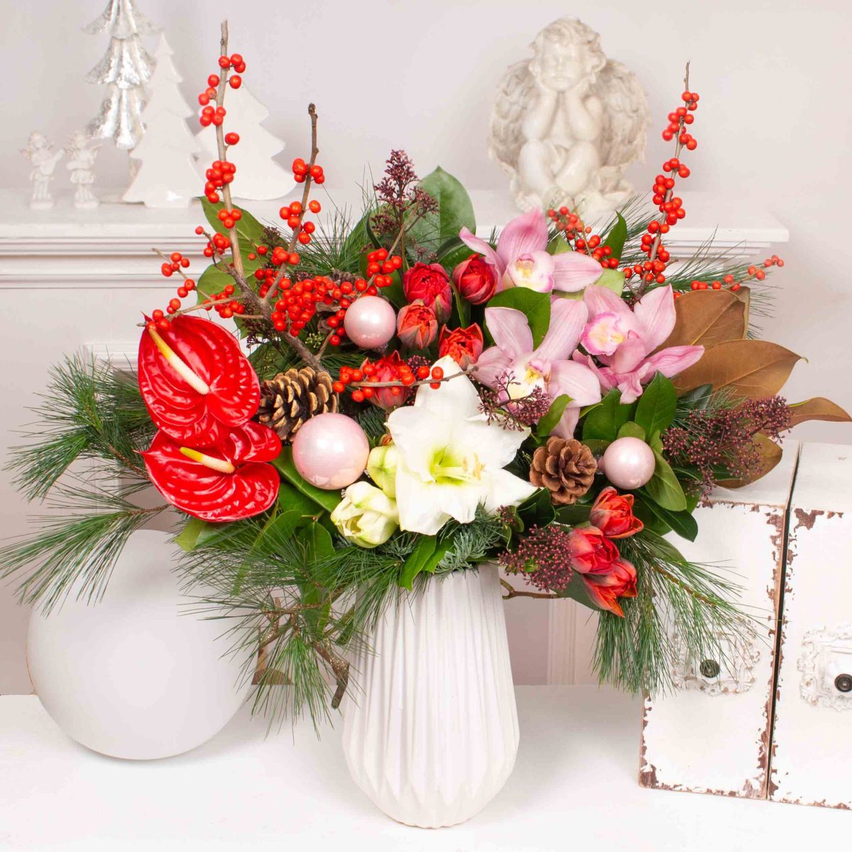 Buchet cu 3 orhidee, ilex rosu, amaryllis, verdeata si alte flori