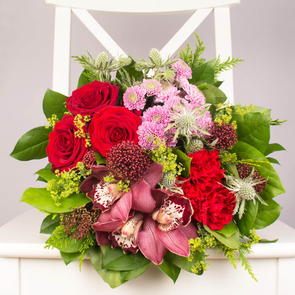 Florile aduc bucurie si iubire de fiecare data cand sunt daruite din suflet. Acest buchet cu trandafiri, orhidee si crizanteme comandat prin floraria online Purple Flowers este o surpriza deosebita si cu siguranta va schimba ziua persoanei care il va primi. Adauga un mesaj personalizat si fa o bucurie cuiva drag. Spune “Te iubesc!”, “La multi ani!”, “Felicitari!” cu un buchet de flori!