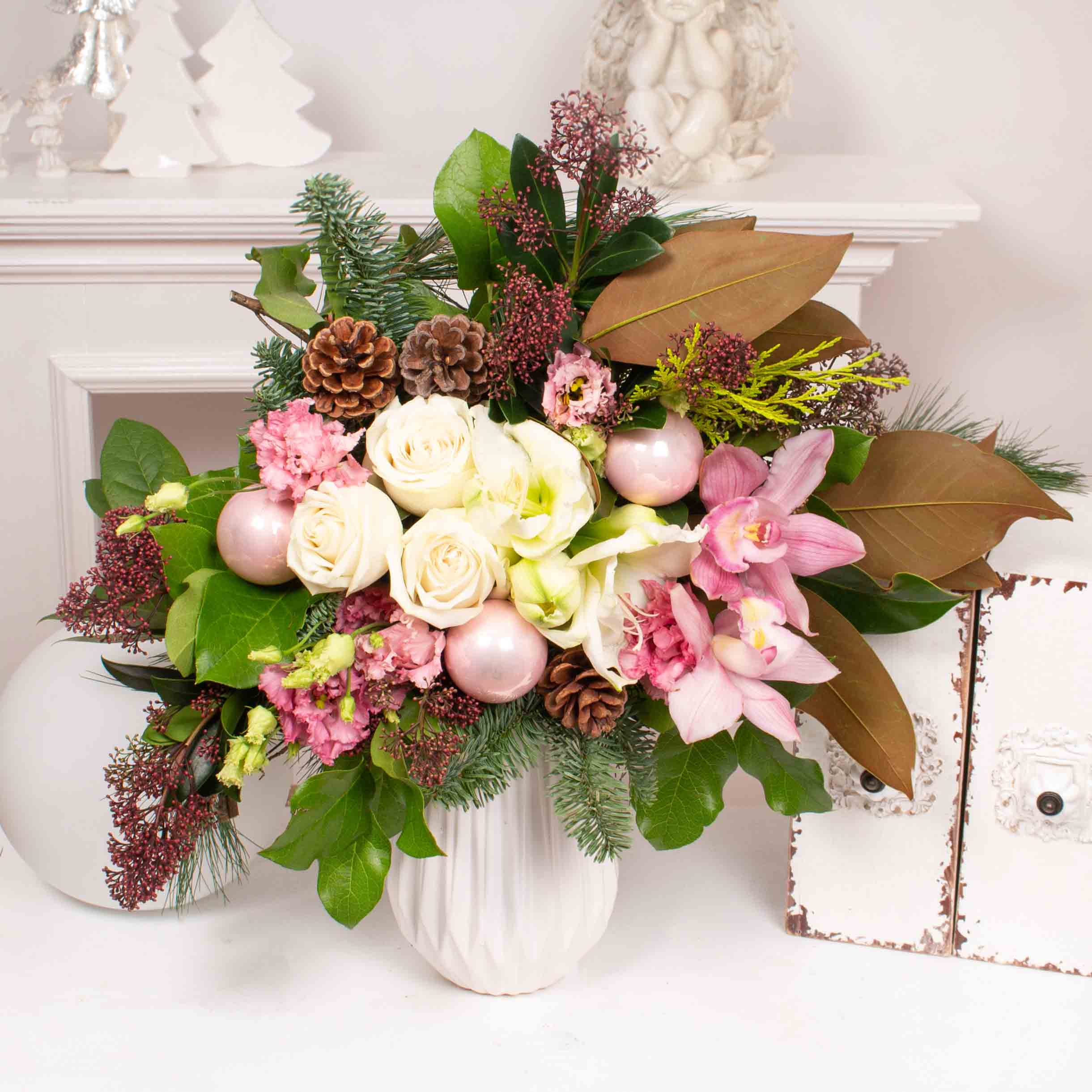 Buchet cu 2 orhidee, 2 cymbidium, 3 trandafiri albi, verdeata si alte flori