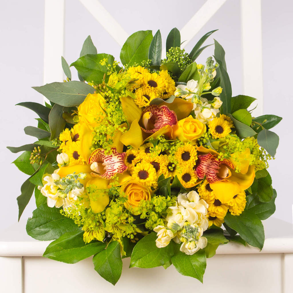 Buchet cu 3 trandafiri galbeni, 3 orhidee, 4 crizanteme, verdeata si alte flori
