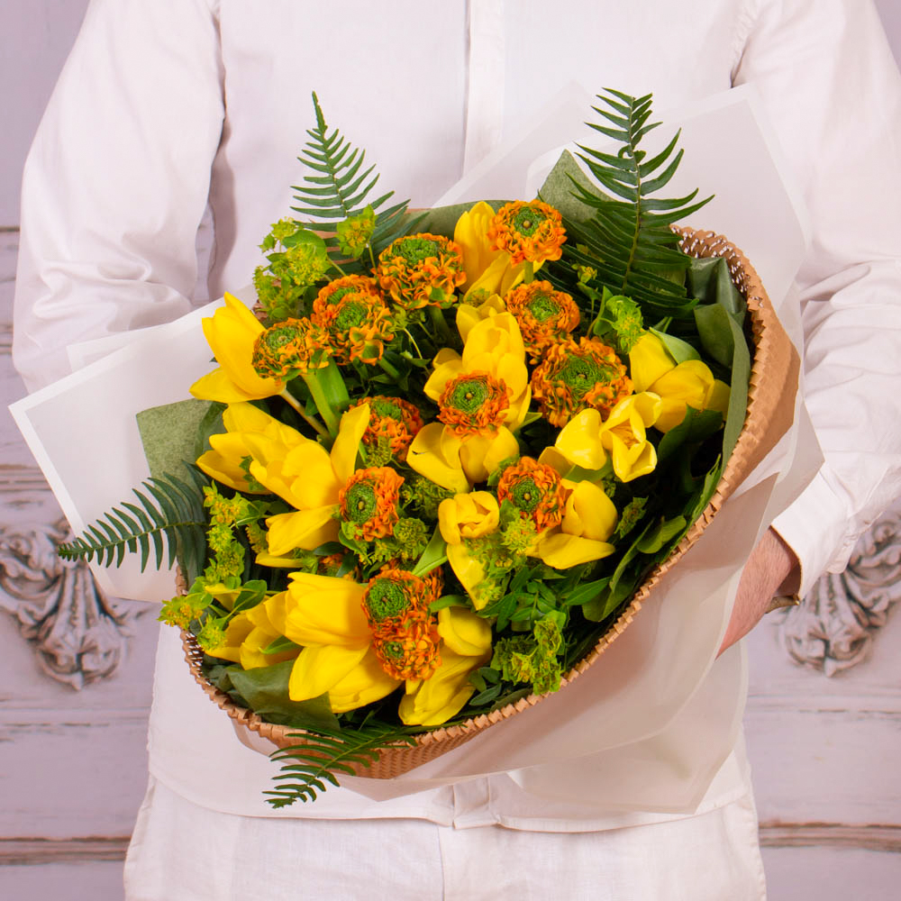 Buchet cu 13 ranunculus, 13 lalele galbene, 3 bupleurum, verdeata si alte elemente de decor.