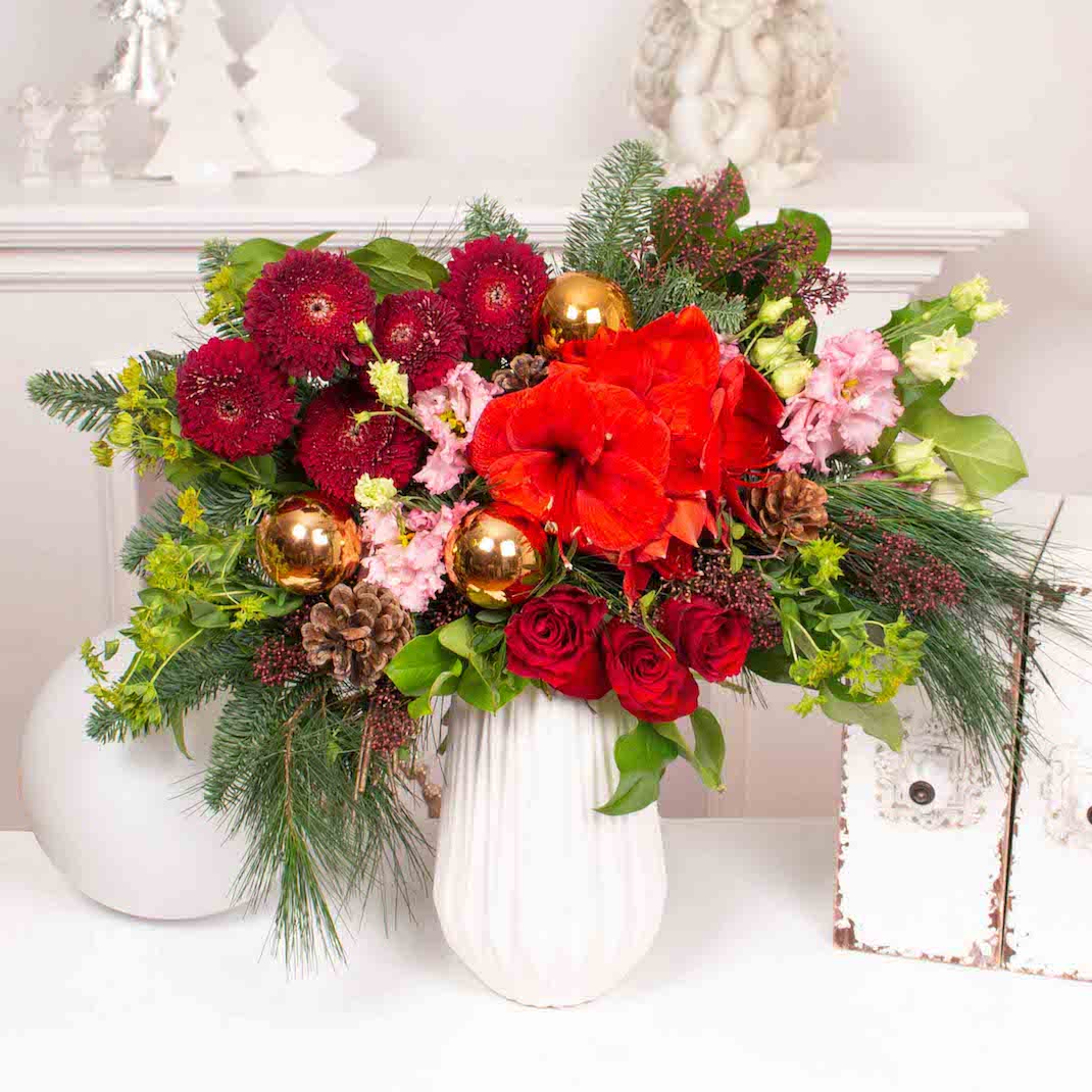 Buchet cu trandafiri, amaryllis, gerbera, alte flori si globuri aurii