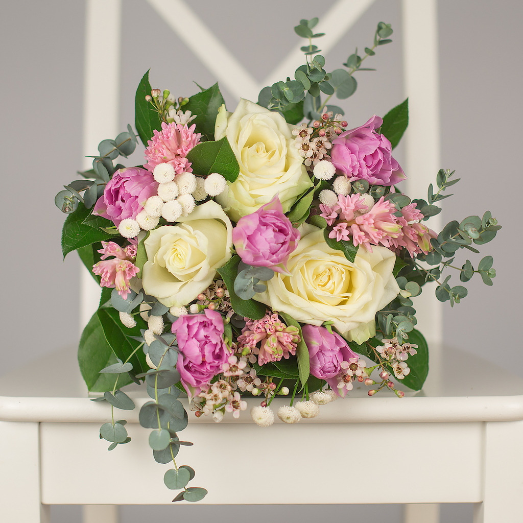 Buchet cu 3 trandafiri albi, 5 lalele roz-mov, 5 zambile roz, verdeata si alte flori