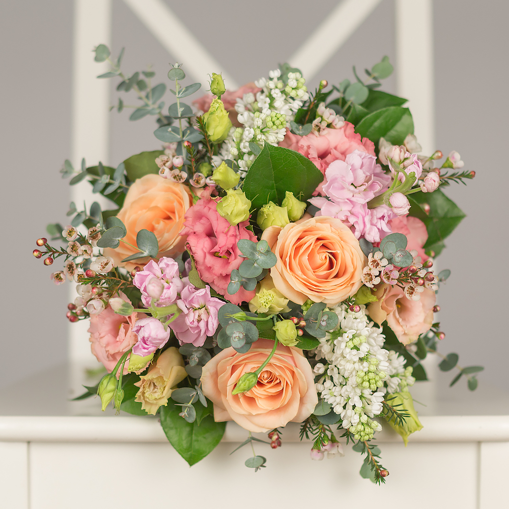 Buchet cu 3 trandafiri, 2 lisianthus roz, 2 matthiola, verdeata si alte flori
