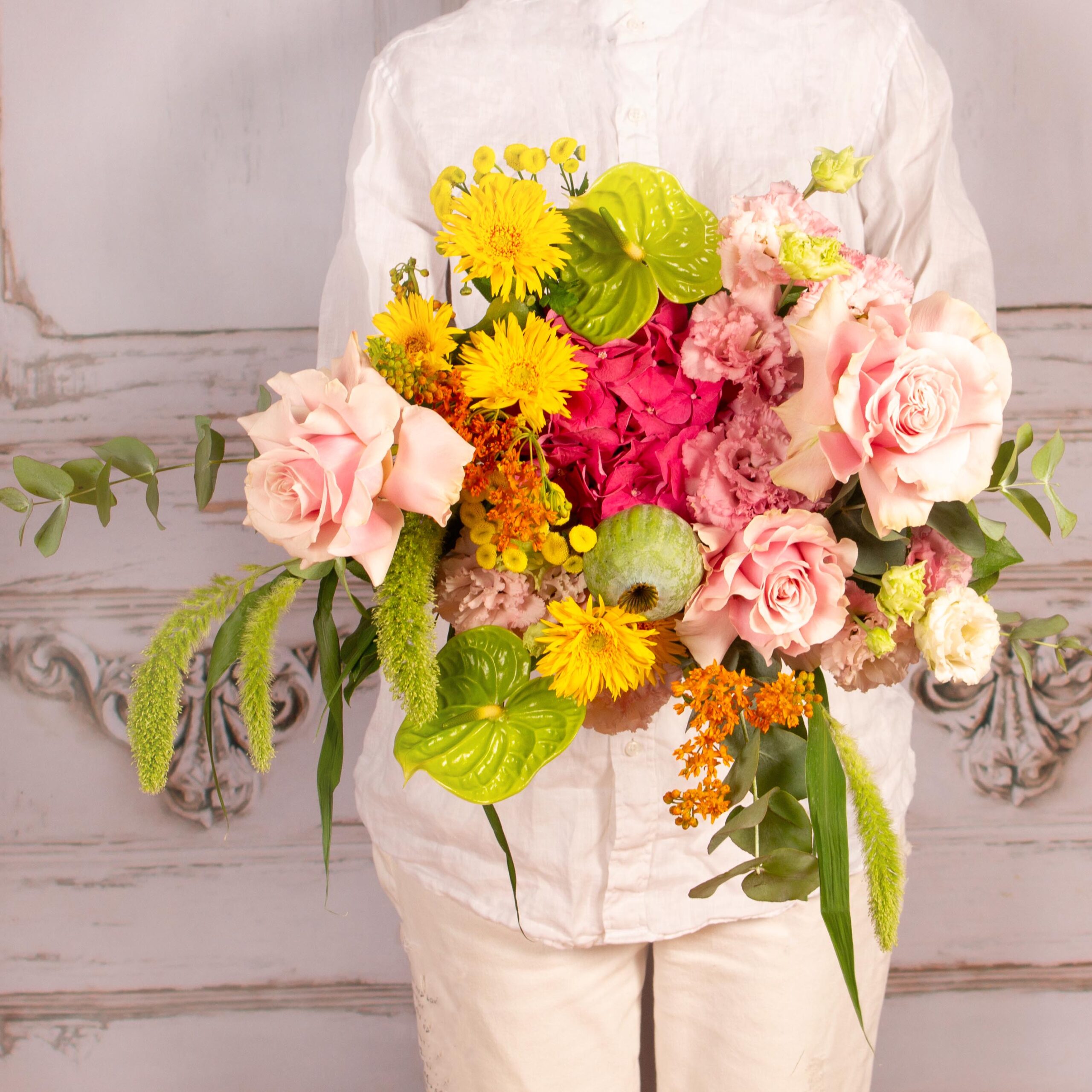 Buchet cu 3 trandafiri roz pal, 5 germini galben, 2 anthurium verde, 4 setaria, 2 tanacetum galbe, verdeata si alte flori de decor.