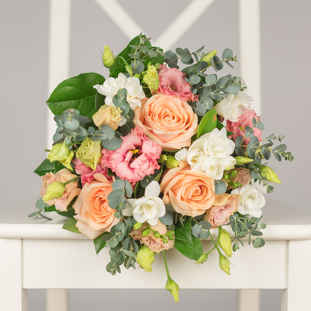 Buchet cu 5 frezii albe, 3 trandafiri, verdeata si alte flori