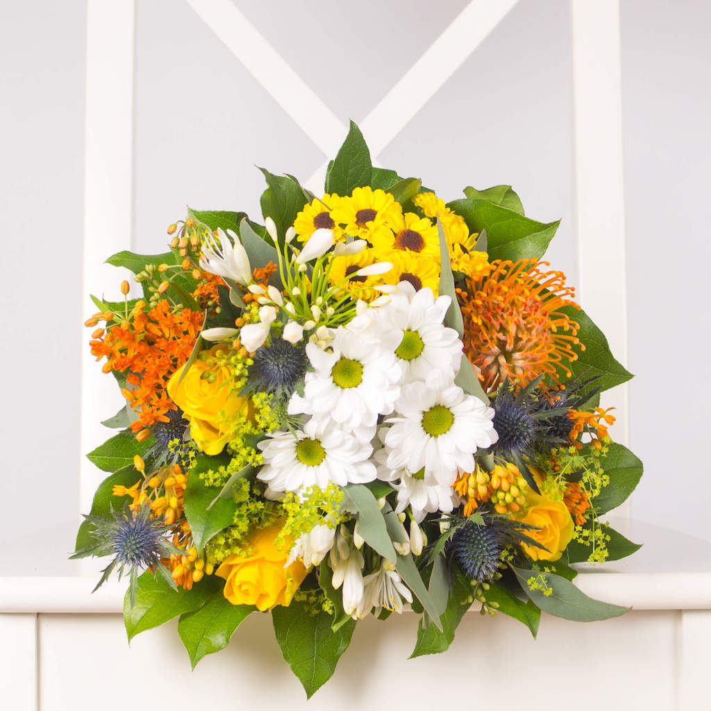 Florile daruite din suflet transmit emotii frumoase celor dragi. Mai ales buchetele de toamna. Combinatiile de flori galbene, portocalii si rosii sunt cele mai spectaculoase toamna. Si pentru ca stim ca sunt momente pe care ati vrea sa le pastrati mereu in amintire, am creat acest buchet cu trandafiri, protea si crizanteme pentru a sarbatori evenimentele fericite din viata voastra. Potrivit persoanelor mereu vesele si pline de viata, un astfel de cadou le va insenina cu siguranta ziua. Adauga un mesaj personalizat si transforma o zi banala intr-o amintire frumoasa!