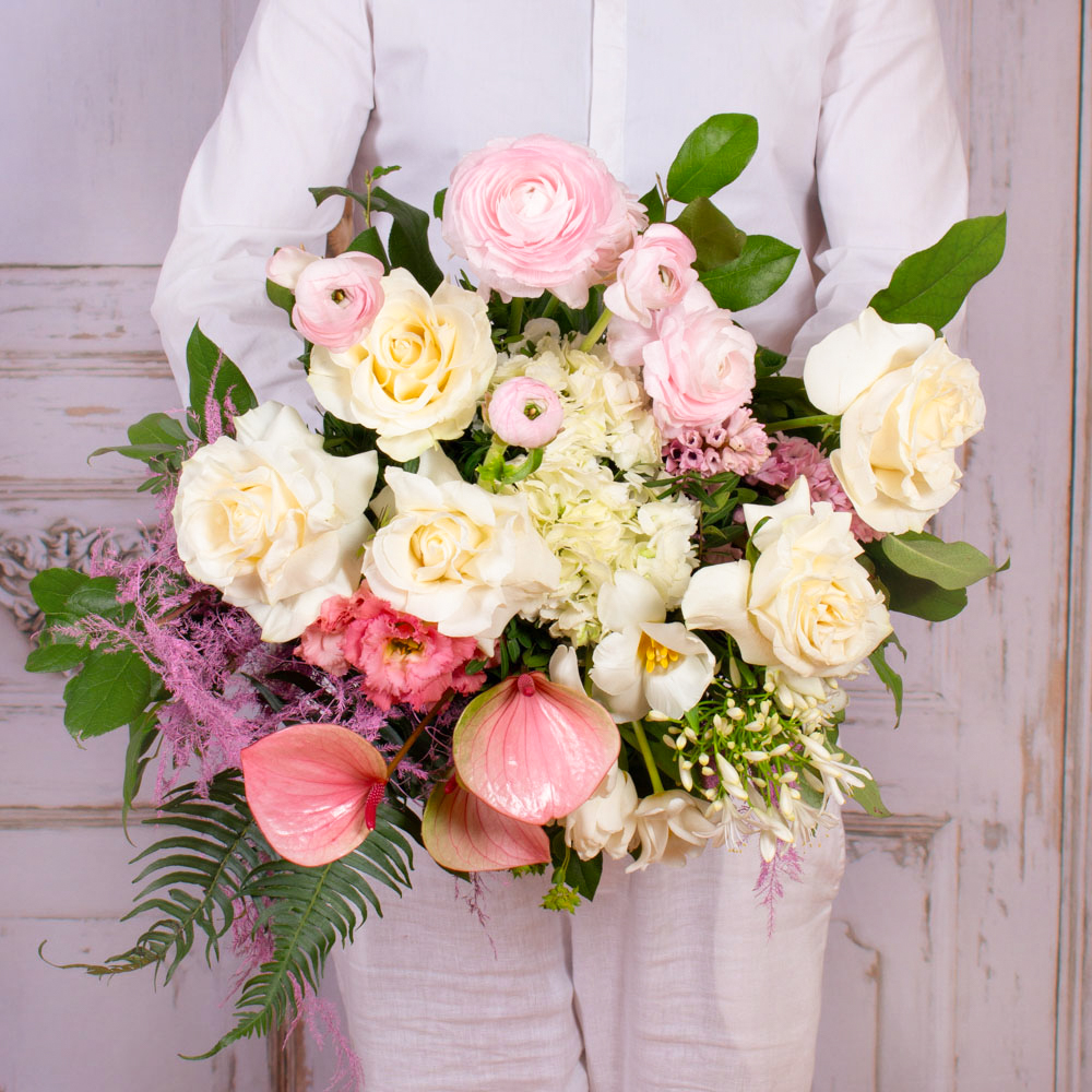 Buchet de primavara cu 5 trandafiri albi, 3 ranunculus, 2 zambile roz, lisianthus roz, 3 lalele albe, verdeata si alte flori de decor.
