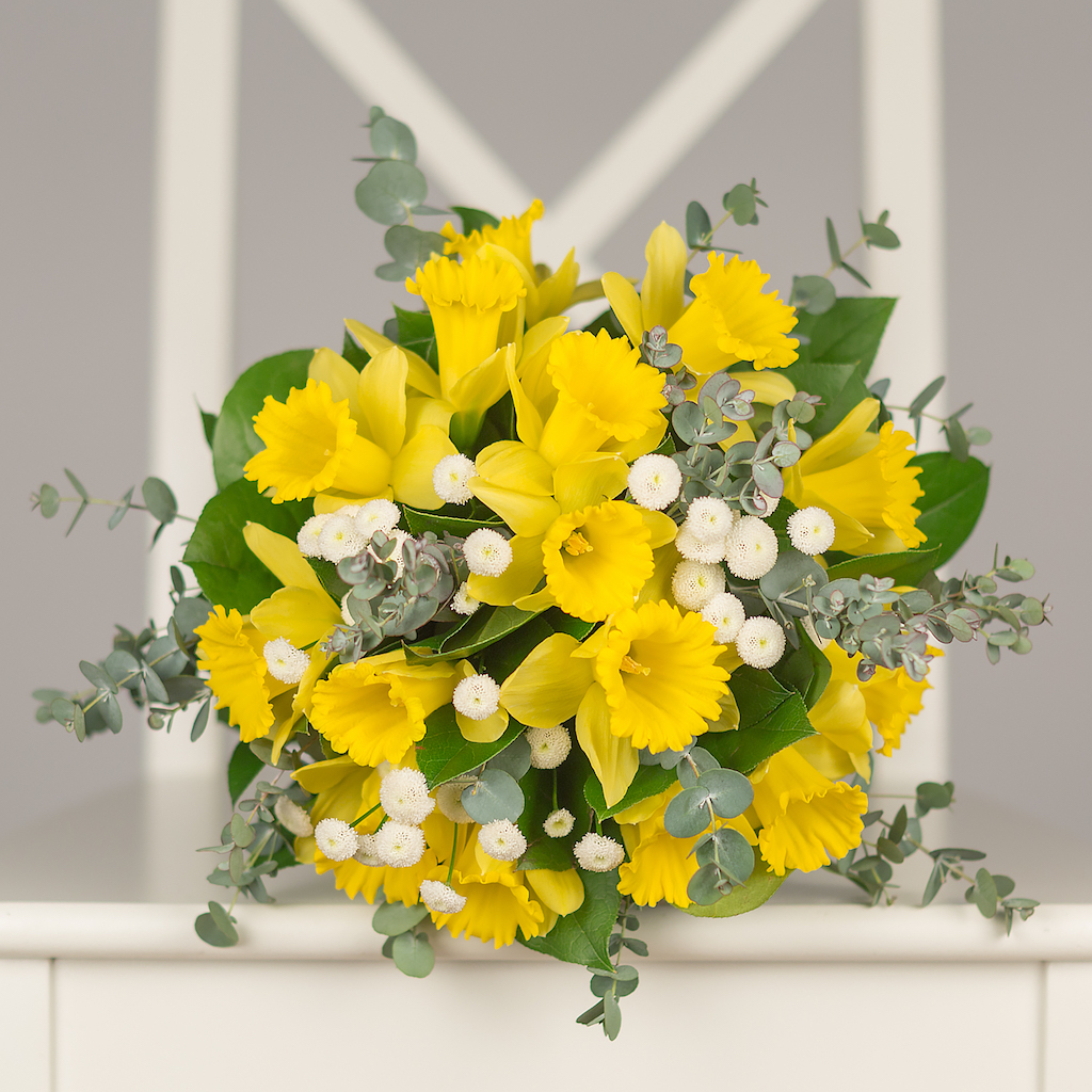 Buchet cu 16 narcise galbene, verdeata si alte flori
