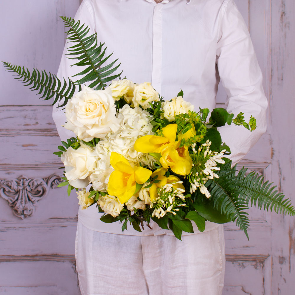 Buchet de primavara cu hortensia alba, 3 trandafiri albi, 5 lalele galbene, 3 lisianthus, verdeata si alte flori de decor.