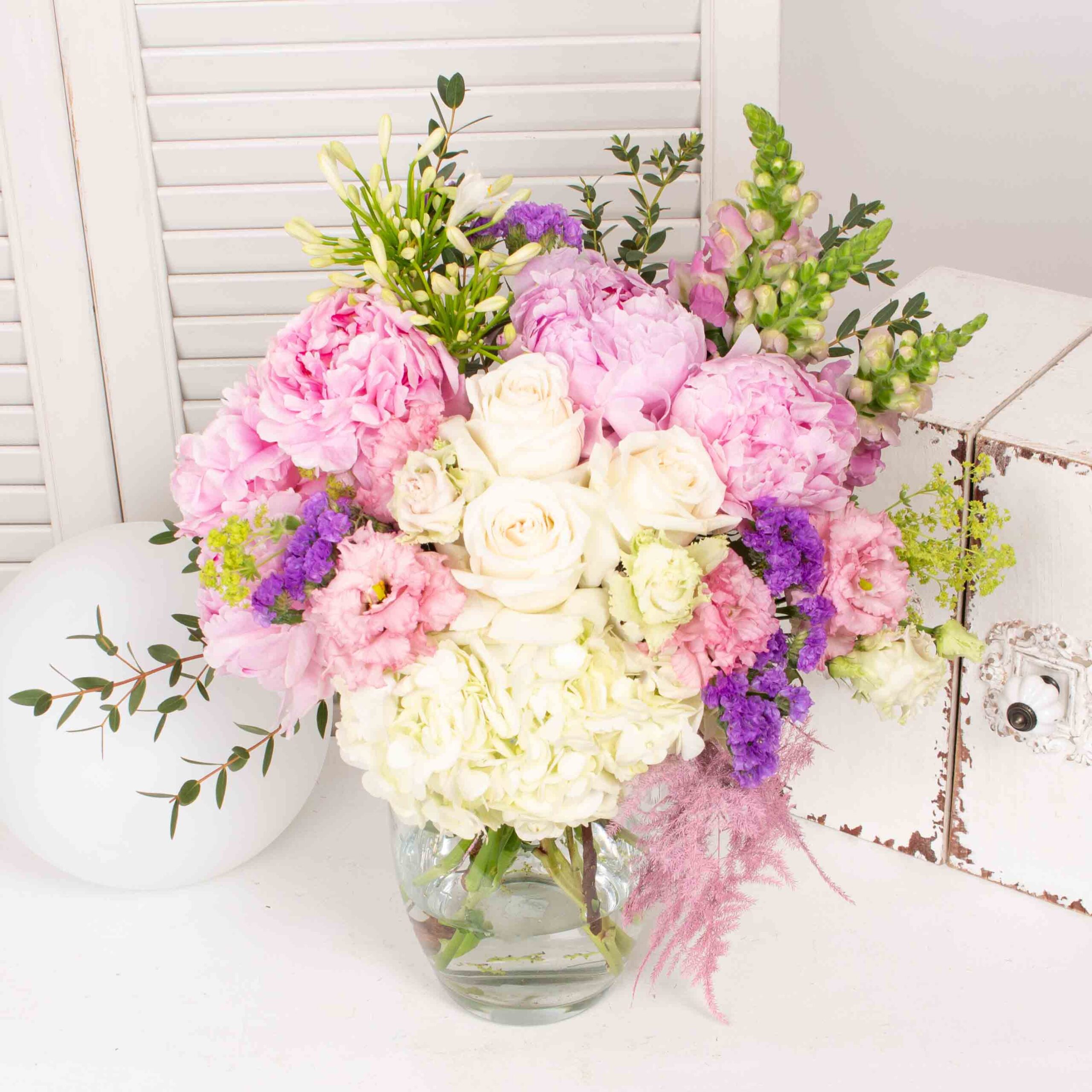 Vaza de sticla si buchet cu hortensie alba, 3 trandafirii albi, 5 bujori roz, lisianthus roz, verdeata si alte flori