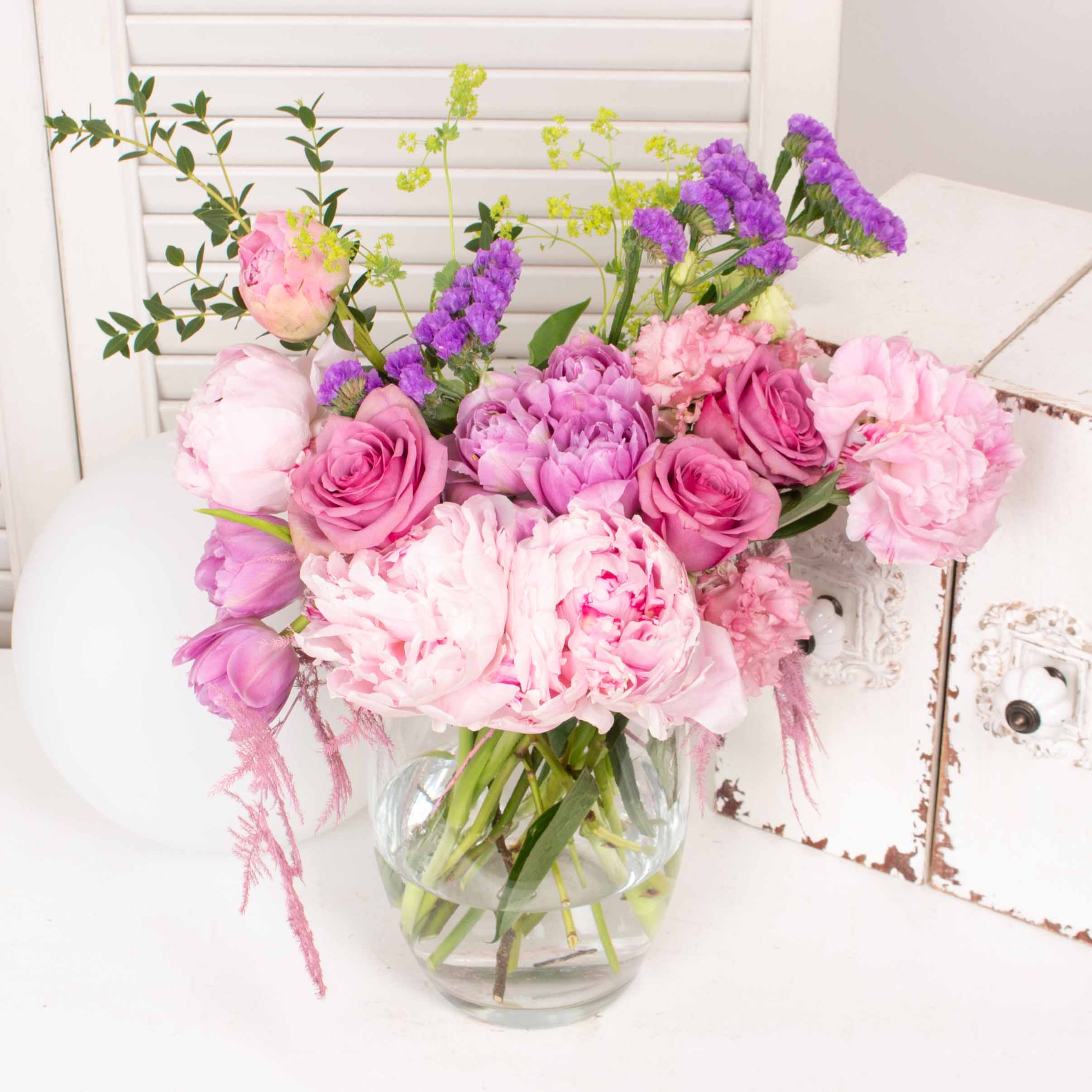 Vaza de sticla si buchet cu 5 bujori roz, 5 lalele mov, 3 trandafiri, verdeata si alte flori