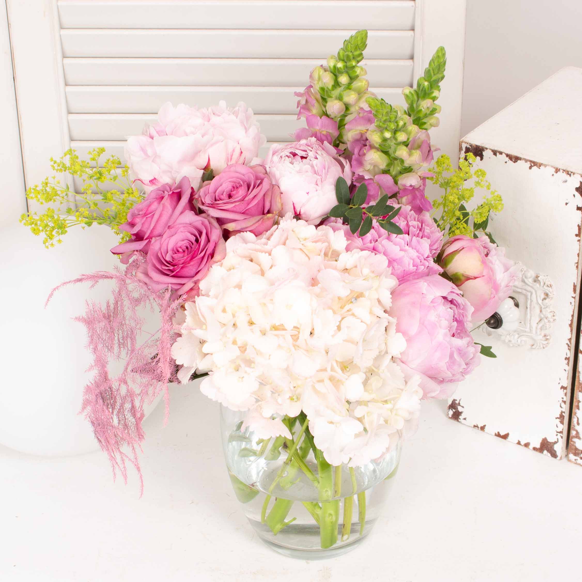 Vaza de sticla si buchet cu hortensie roz, 5 bujori albi, 3 trandafiri roz-mov, verdeata si alte flori