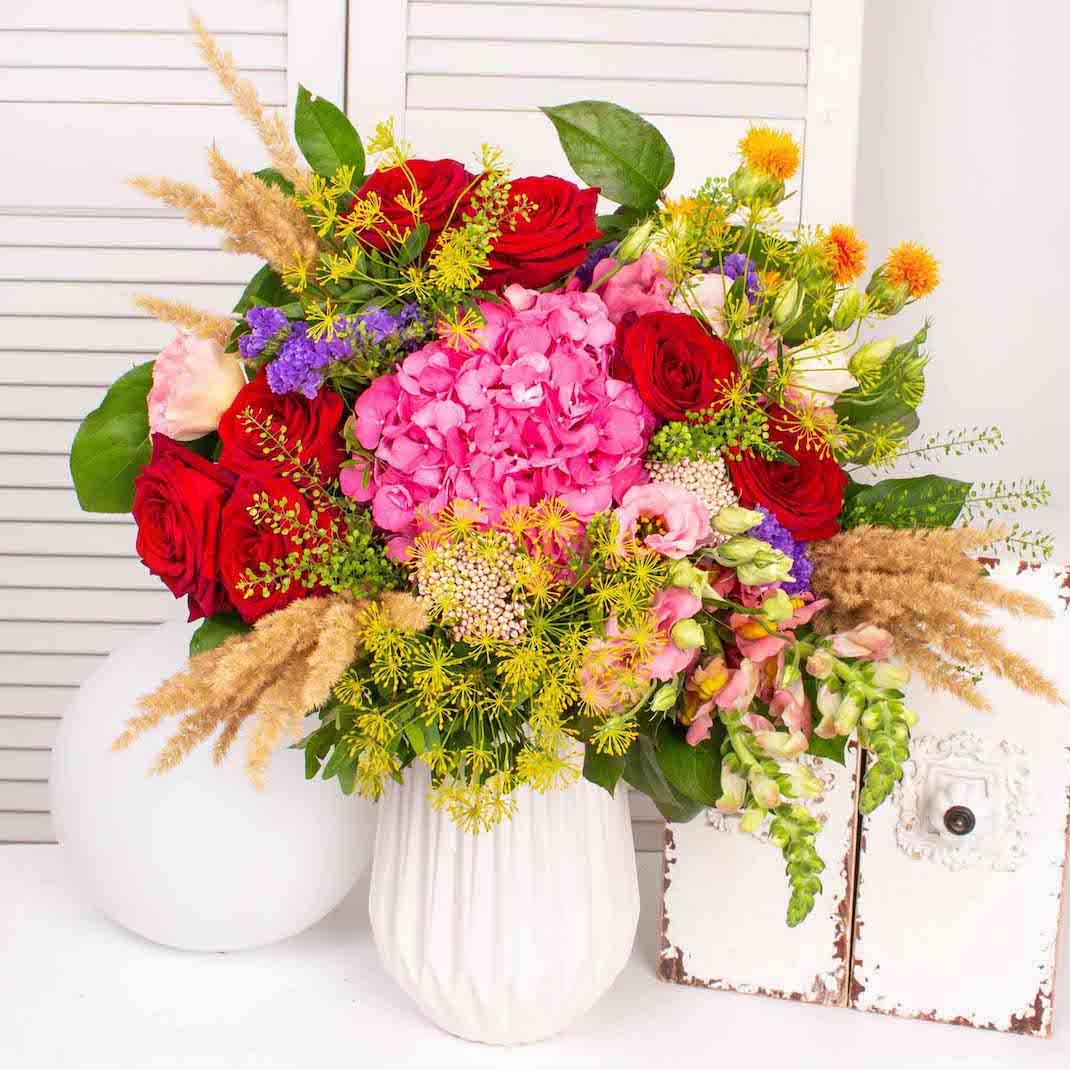 Buchet cu 7 trandafiri rosii, hortensie roz, 2 anthirinum portocaliu, 2 lisianthus roz, verdeata si alte flori