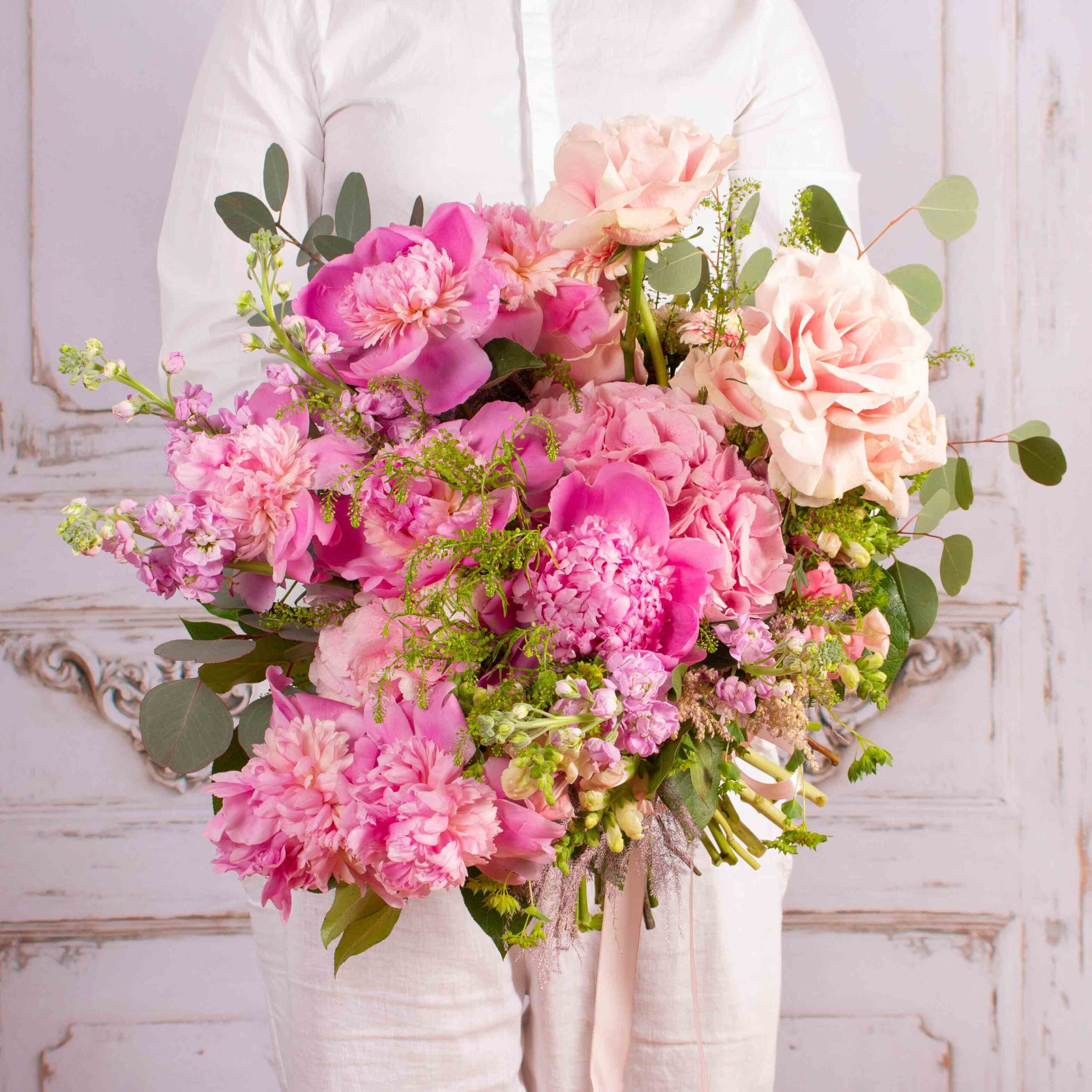 Buchet cu hortensie roz, 5 trandafiri roz, 7 bujori, verdeata si alte flori