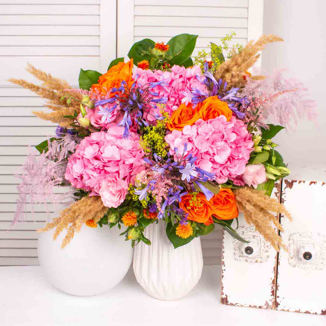 Buchet cu 3 hortensii roz, 7 trandafiri portocalii, 3 lisianthus roz, 3 agapanthus albastru, verdeata si alte flori