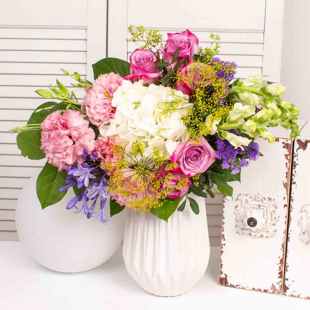 Buchet cu hortensie, 5 trandafiri roz, 2 anthirinum alb, verdeata si alte flori