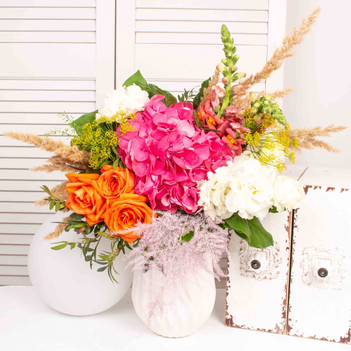 Buchet cu hortensie roz, 3 trandafiri portocalii, 2 anthurium, verdeata si alte flori