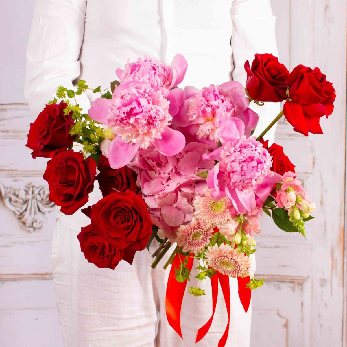Florile aduc bucurie si iubire de fiecare data cand sunt daruite din suflet. Acest buchet cu trandafiri rosii si bujori comandat prin floraria online Purple Flowers este o surpriza deosebita si cu siguranta va schimba ziua persoanei care il va primi. Adauga un mesaj personalizat si fa o bucurie cuiva drag. Spune “Te iubesc!”, “La multi ani!”, “Felicitari!” cu un buchet de flori!