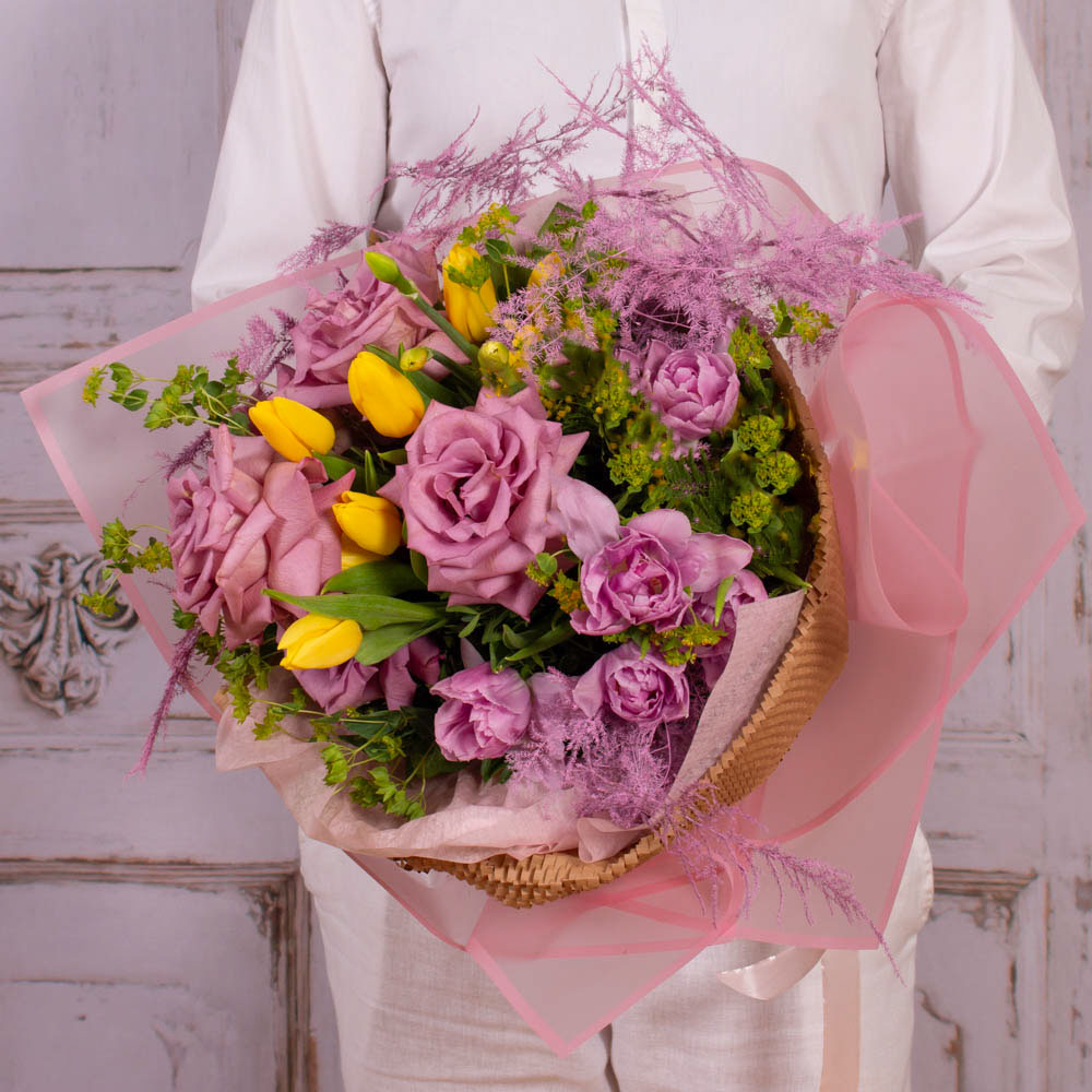 Buchet cu 5 trandafiri roz, 7 lalele galbene, 5 lalele mov, verdeata si alte flori de decor.